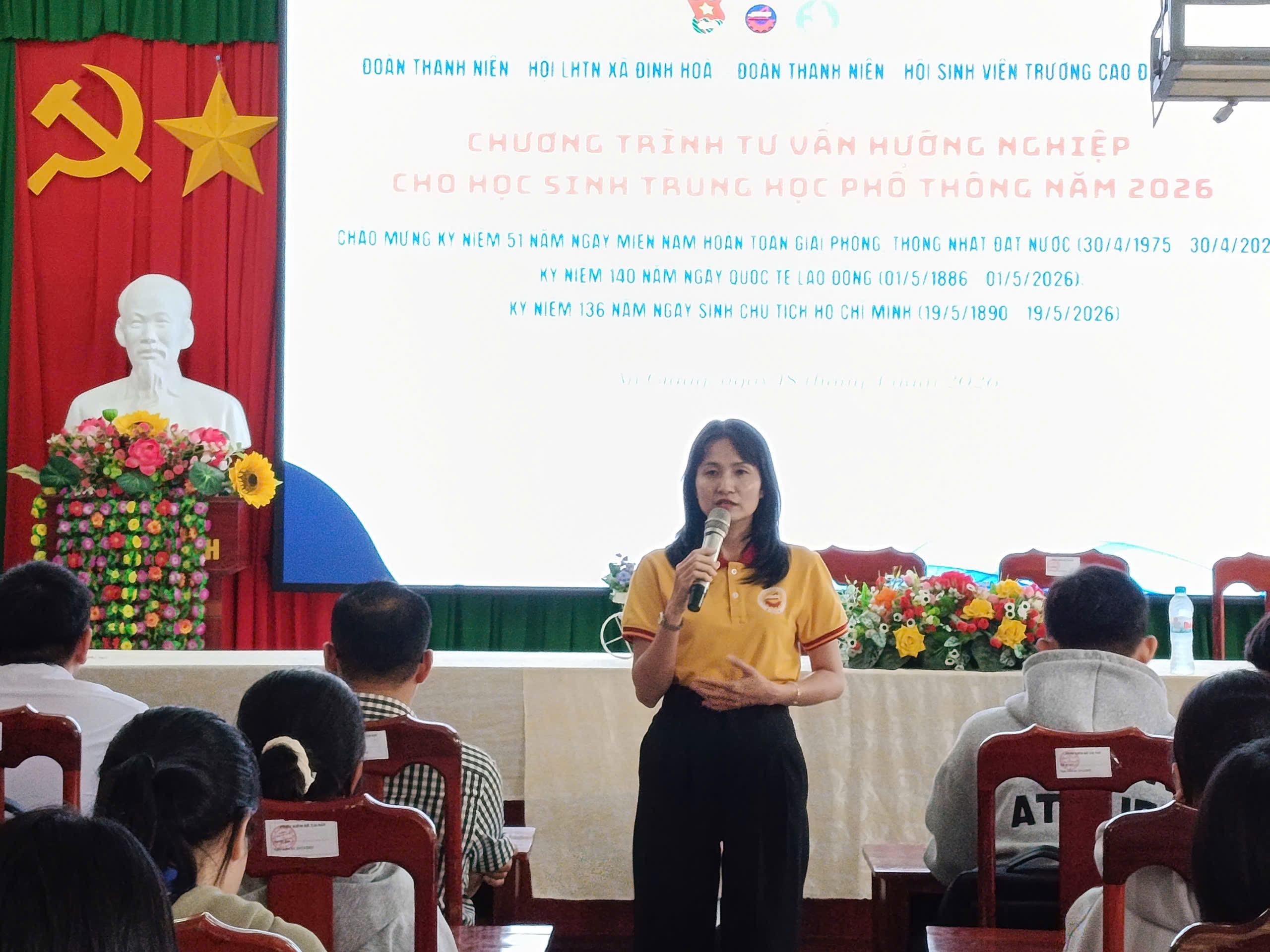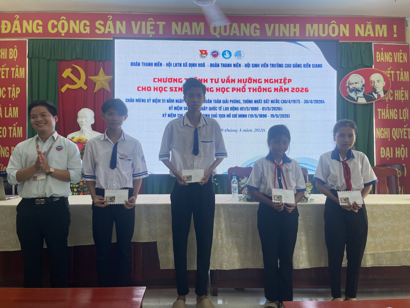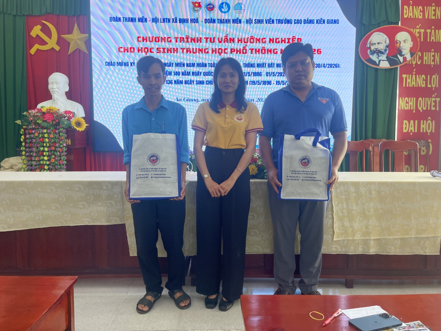 Nhằm thiết thực lập thành tích chào mừng kỷ niệm 51 năm Ngày Giải phóng miền Nam, thống nhất đất nước (30/4/1975–30/4/2026); kỷ niệm 140 năm Ngày Quốc tế Lao động (01/5/1886–01/5/2026) và kỷ niệm 136 năm Ngày sinh Chủ tịch Hồ Chí Minh (19/5/1890–19/5/2026), chiều ngày 18/4/2026, Ban Chấp hành Đoàn Trường, Hội Sinh viên Trường Cao đẳng Kiên Giang đã phối hợp với BCH Xã Đoàn Định Hoà tổ chức chương trình tư vấn hướng nghiệp cho học sinh khối 12 tại Trường THCS–THPT Thới Quản, xã Định Hòa, tỉnh An Giang.