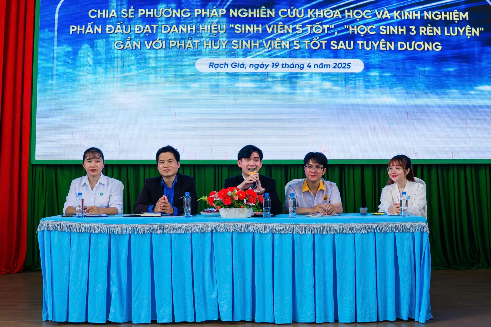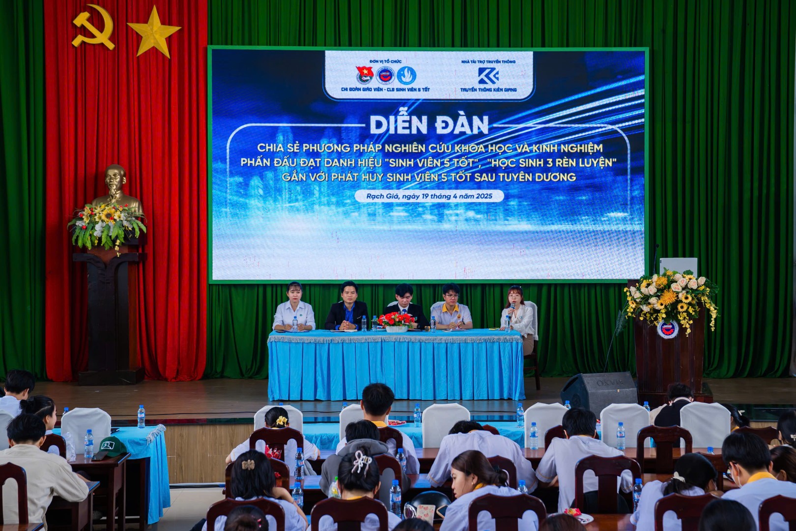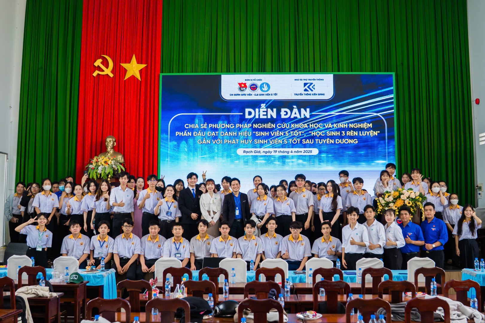 Vào sáng ngày 19/4/2025 tại Hội trường 425 Mạc Cửu, Chi đoàn giáo viên và CLB Sinh viên 5 tốt đã phối hợp thực hiện Diễn đàn chia sẻ phương pháp nghiên cứu khoa học và kinh nghiệm phấn đấu đạt danh hiệu “Sinh viên 5 tốt” – “Học sinh 3 rèn luyện”, gắn với phát huy Sinh viên 5 tốt sau tuyên dương. Đến dự buổi họp mặt có Đ/c Nguyễn Văn Tuấn Vũ – Uỷ viên Ban thường vụ Tỉnh Đoàn, Bí thư Đoàn trường; đ/c Ngô Ngọc Bích Tuyền – Phó Bí thư Đoàn trường, Chủ tịch Hội sinh viên trường; Đ/c Nguyễn Nhựt Long – Uỷ viên Ban thường vụ Đoàn trường, Phó Chủ tịch Hội sinh viên trường, Sinh viên 5 tốt cấp Trung ương năm 2024; Đ/c Nguyễn Quốc Dương – Uỷ viên Ban chấp hành Đoàn trường, Học sinh 3 rèn luyện cấp tỉnh năm 2024, cùng đại diện Đoàn các khoa và Ban chủ nhiệm các Câu lạc bộ và hơn 120 sinh viên trường.