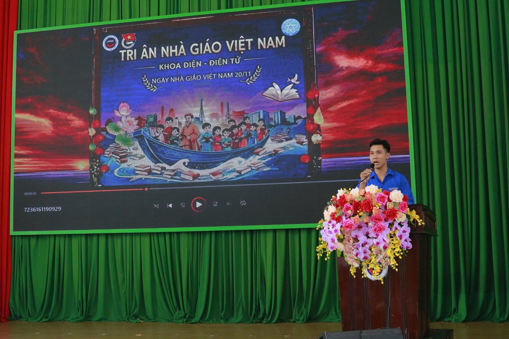 Chương trình mở đầu với tiết mục văn nghệ mang đậm ý nghĩa tri ân, ca khúc “Bụi Phấn” được trình bày bằng guitar bởi sinh viên năm nhất. Giai điệu quen thuộc như lời nhắc nhở về những cống hiến thầm lặng nhưng vô giá của những người làm công tác giáo dục. Tiếp theo chương trình, bạn Nguyễn Phúc Trường, lớp trưởng lớp CNKT điện, điện tử 1 khóa 19, đại diện các bạn tân sinh viên phát biểu cảm nghĩ về những ngày đầu học tập tại trường – nơi các bạn nhận được sự định hướng tận tình và môi trường học thuật giàu tính nhân văn. Đại diện sinh viên năm cuối, bạn Nguyễn Văn Cương, lớp phó lớp Kỹ thuật Máy lạnh và Điều hòa không khí 2 khóa 17, đã gửi đến quý thầy cô lời tri ân sâu sắc vì sự dìu dắt, tận tụy và những kiến thức quý báu được truyền đạt trong suốt quá trình học tập.