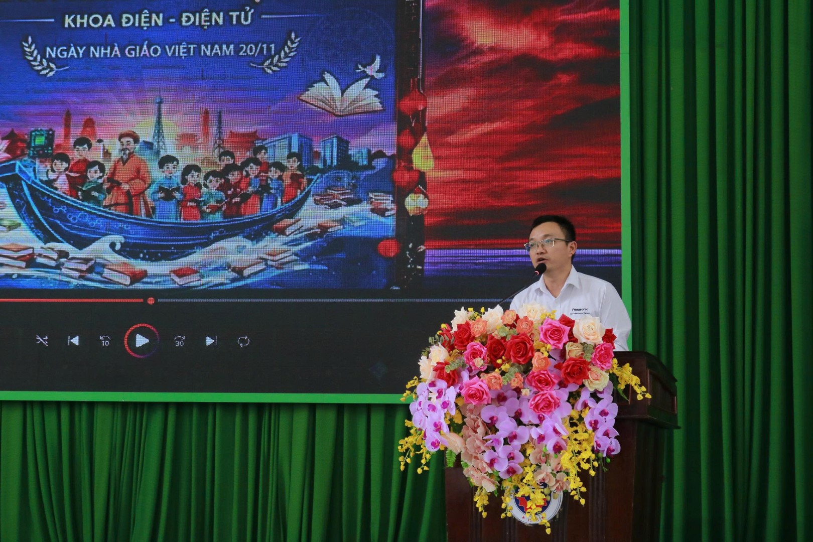 Chương trình cũng vinh dự đón tiếp đại diện Công ty TNHH Panasonic Việt Nam – anh Trần Phước Thành. Trong bài phát biểu, anh ghi nhận sự hợp tác hiệu quả giữa doanh nghiệp và khoa Điện – Điện tử, đồng thời bày tỏ kỳ vọng tiếp tục đồng hành trong công tác đào tạo nguồn nhân lực chất lượng cao. Kết thúc buổi lễ, thầy Đoàn Quốc Hưng, Trưởng khoa Điện – Điện tử, thay mặt tập thể giảng viên gửi lời cảm ơn chân thành đến toàn thể sinh viên vì những tình cảm trân quý đã dành cho thầy cô. Thầy cũng nhấn mạnh sứ mệnh của khoa trong việc không ngừng nâng cao chất lượng giảng dạy, góp phần xây dựng đội ngũ kỹ thuật viên có chuyên môn vững vàng và phẩm chất đạo đức tốt.