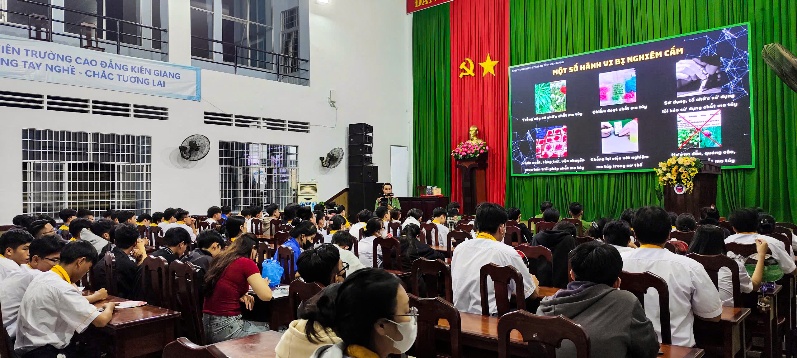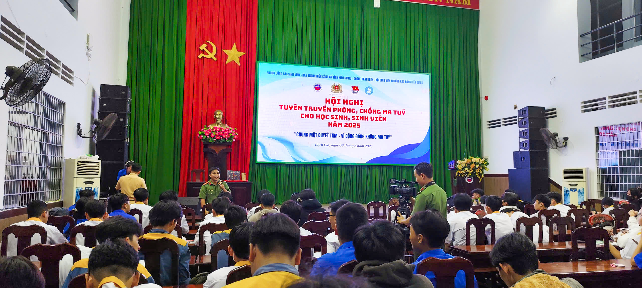 Ngày 09/6/2025, tại hội trường 425 Mạc Cửu Trường Cao đẳng Kiên Giang, Hội nghị “Tuyên truyền phòng chống ma túy cho học sinh, sinh viên năm 2025” đã được tổ chức thành công tốt đẹp. Hội nghị do Phòng Công tác sinh viên, Đoàn Thanh niên, Hội Sinh viên Trường Cao đẳng Kiên Giang phối hợp với Ban Thanh niên Công an tỉnh Kiên Giang tổ chức. Hội nghị thu hút hơn 285 đoàn viên, thanh niên tham gia.