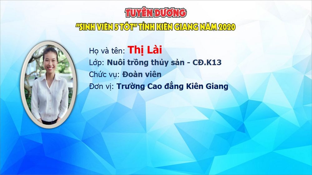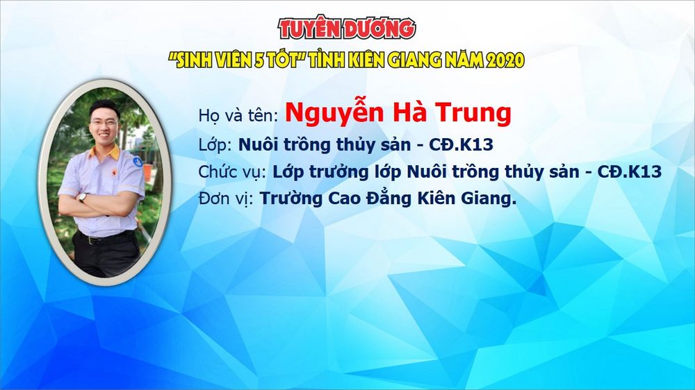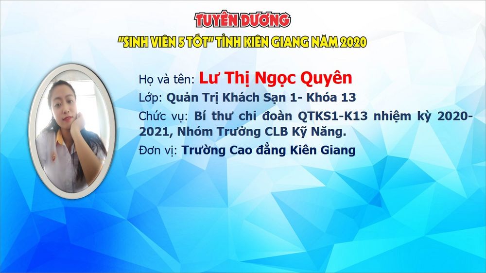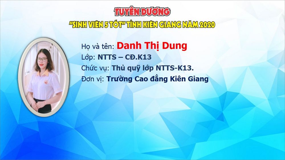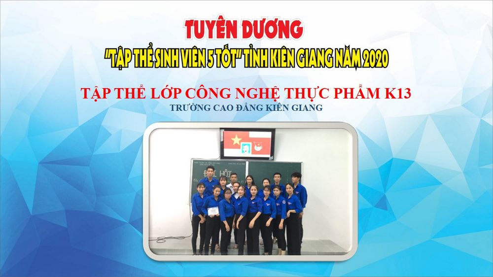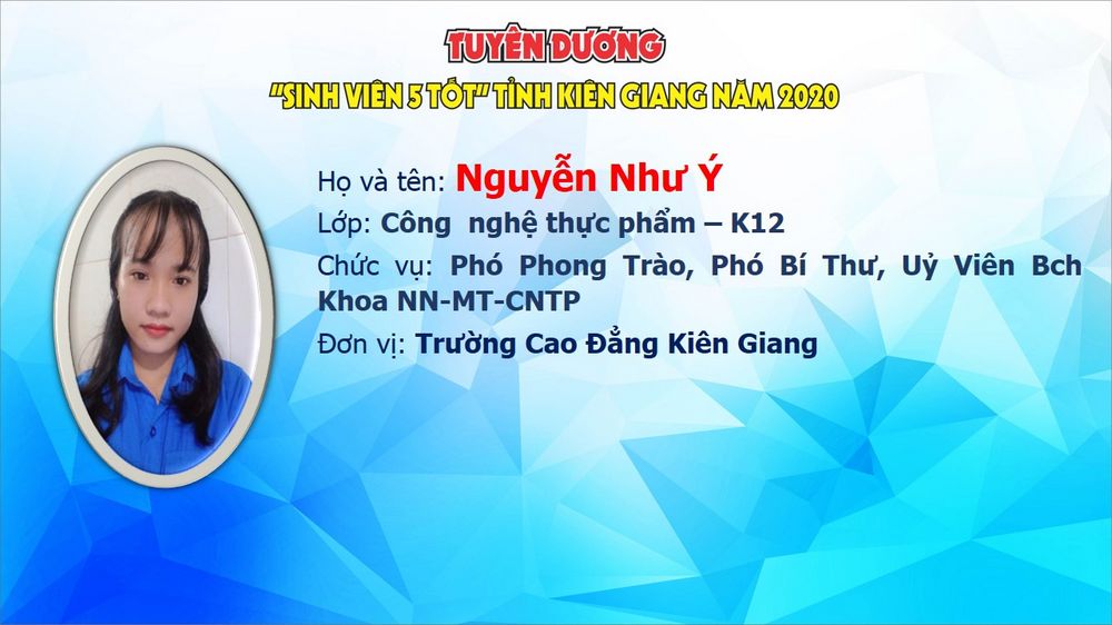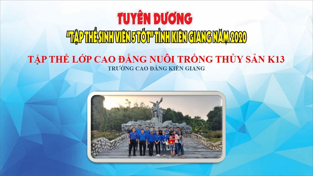 Trong năm học 2019 - 2020, BCH Tỉnh đoàn Kiên Giang đã vinh danh 32 sinh viên đạt danh hiệu “Sinh viên 5 tốt” và 02 tập thể đạt “Tập thể sinh viên 5 tốt” cấp tỉnh, trong đó Trường Cao đẳng Kiên Giang có 13 sinh viên và 02 tập thể được vinh danh. Đây là kết quả của sự phấn đấu không ngừng nghỉ của các cá nhân và tập thể để đạt được danh hiệu cao quý trong thời sinh viên của mình.