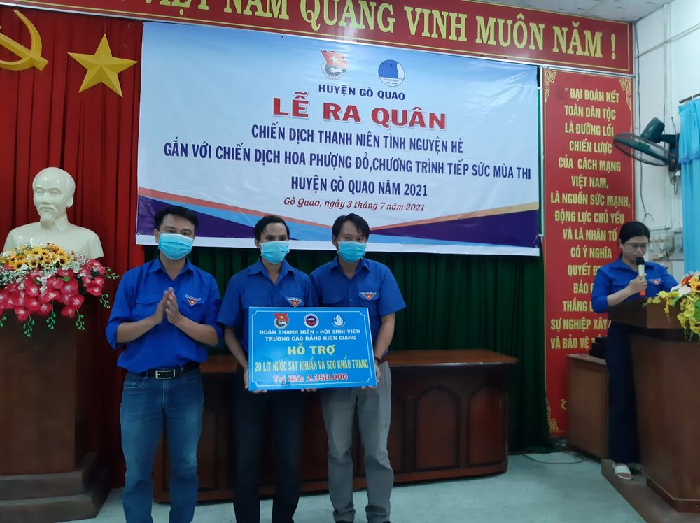 Chương trình “Tiếp sức mùa thi” là hoạt động được diễn ra hàng năm nhằm mục đích hướng dẫn, hỗ trợ, giúp đỡ thí sinh trong kỳ thi Tốt nghiệp Trung học phổ thông và tuyển sinh Đại học, Cao đẳng, góp phần đảm bảo cho kỳ thi diễn ra một cách an toàn, thuận lợi, tạo tâm lý tốt cho thí sinh để đạt kết quả cao nhất. Năm nay, trong bối cảnh diễn biến phức tạp của dịch bệnh COVID-19, để góp phần bảo đảm, mang lại một kỳ thi an toàn và hiệu quả, Hội sinh viên - Đoàn Thanh niên trường Cao đẳng Kiên Giang đã trao tặng cho đơn vị Gò Quao 20 lít nước rửa tay khử khuẩn, 500 khẩu trang y tế và đơn vị Giồng Riềng 20 lít nước rửa tay khử khuẩn.