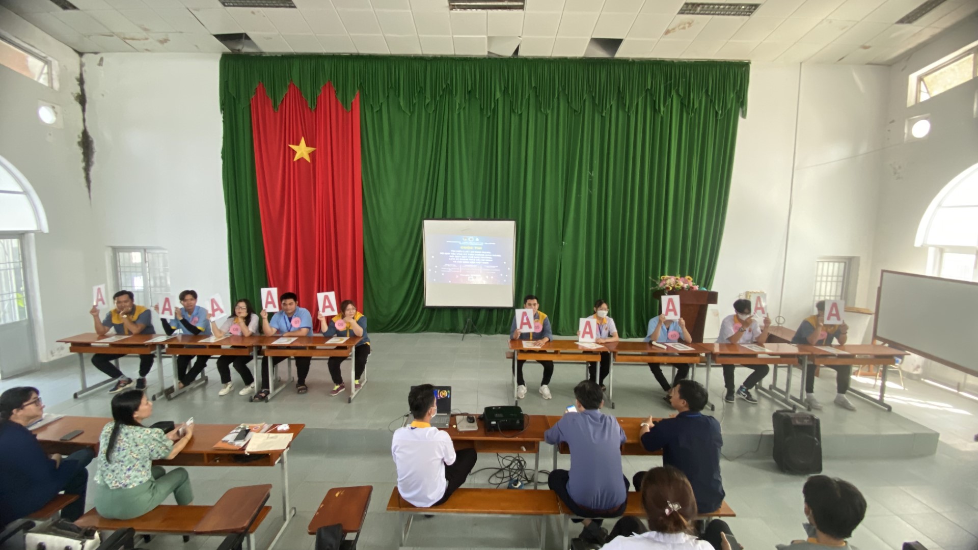 Với những câu hỏi trắc nghiệm kiến thức liên quan đến Luật An ninh mạng, nội quy nhà trường và Đoàn-Hội, các bạn thí sinh đã có cơ hội thử sức và đưa ra các đáp án bằng hình thức giơ bảng trả lời. Sau vòng bán kết, 09 thí sinh xuất sắc nhất bước vào vòng Chung kết tại 3 địa điểm thi cụ thể như sau:
