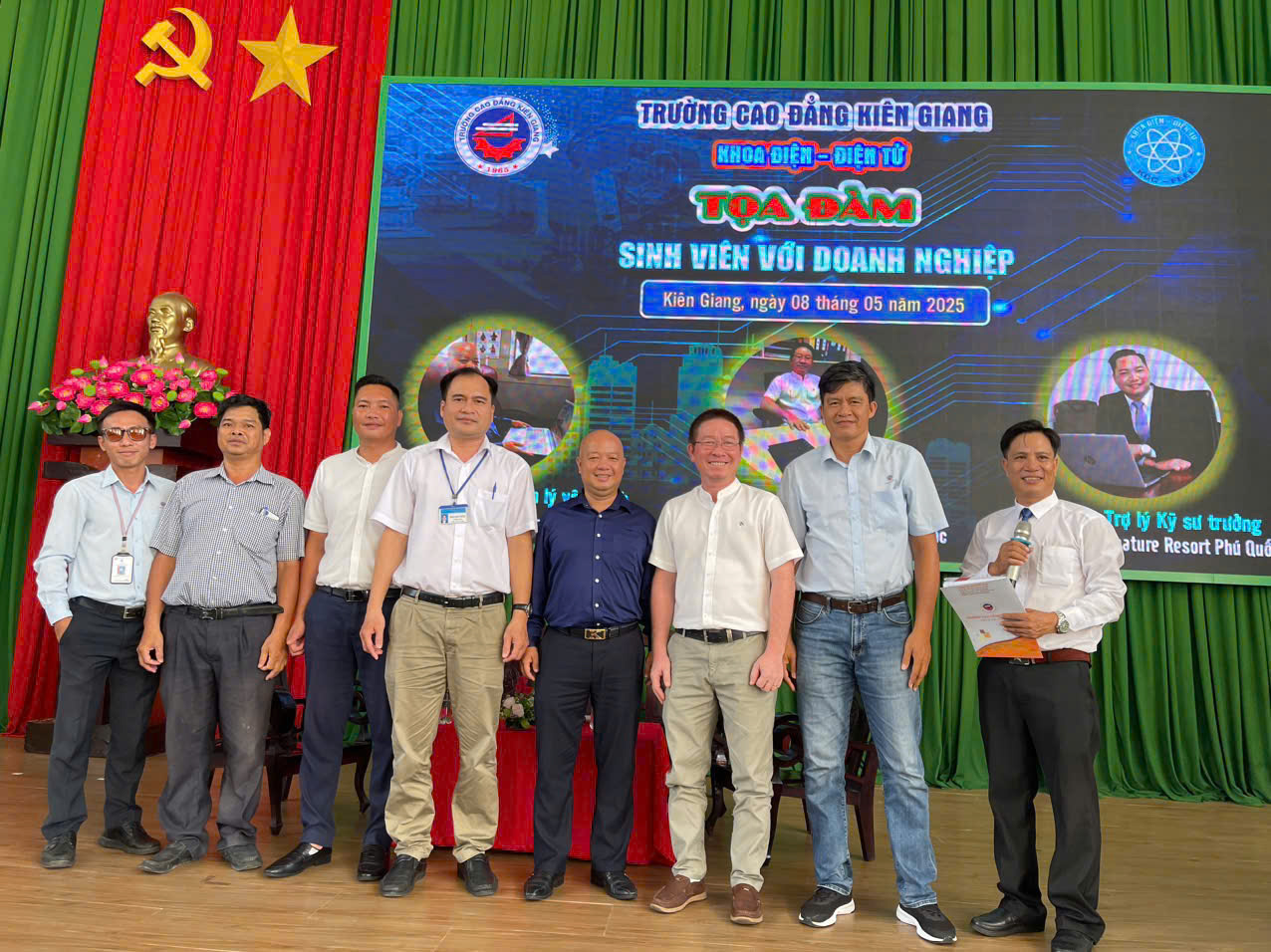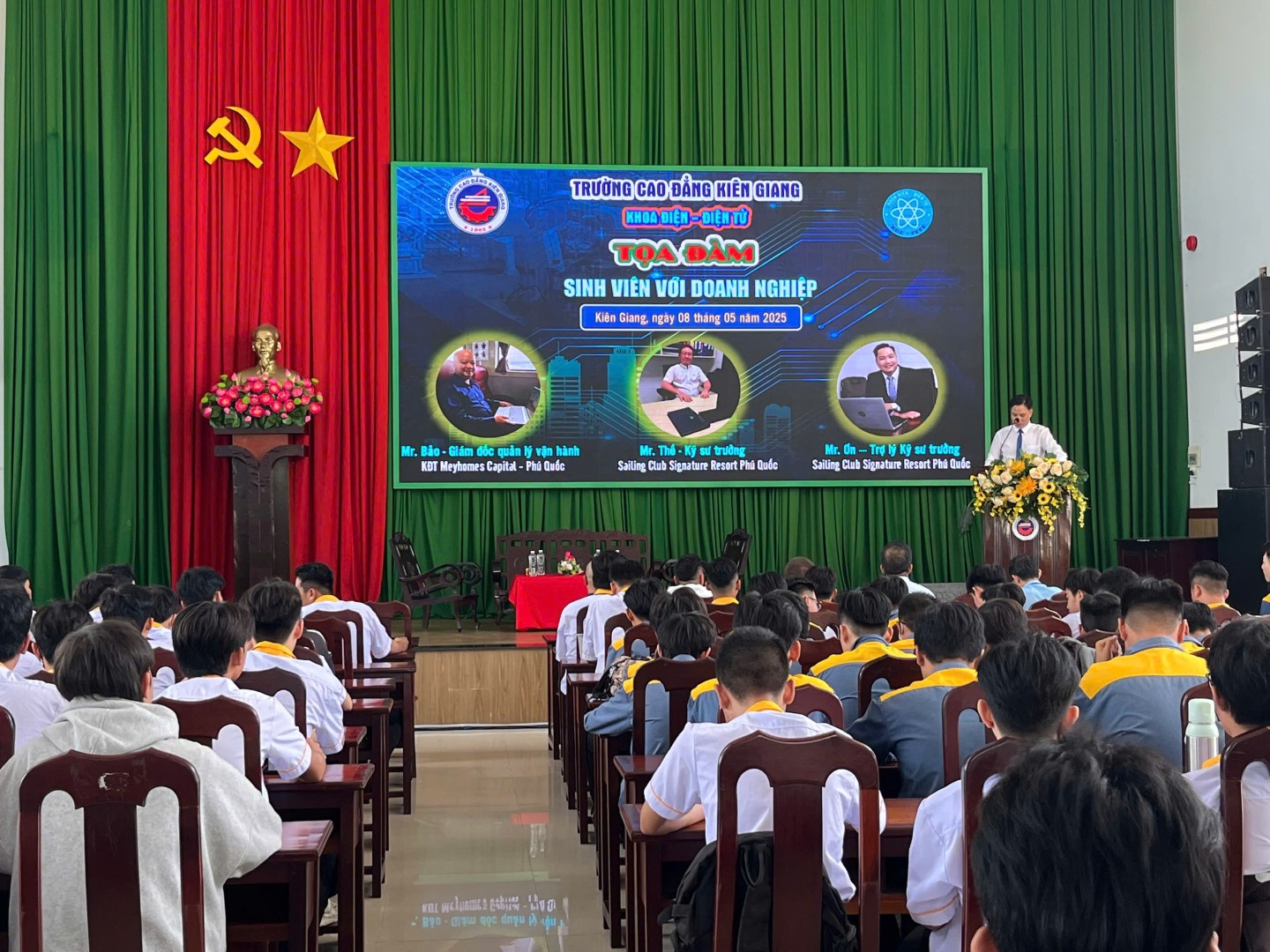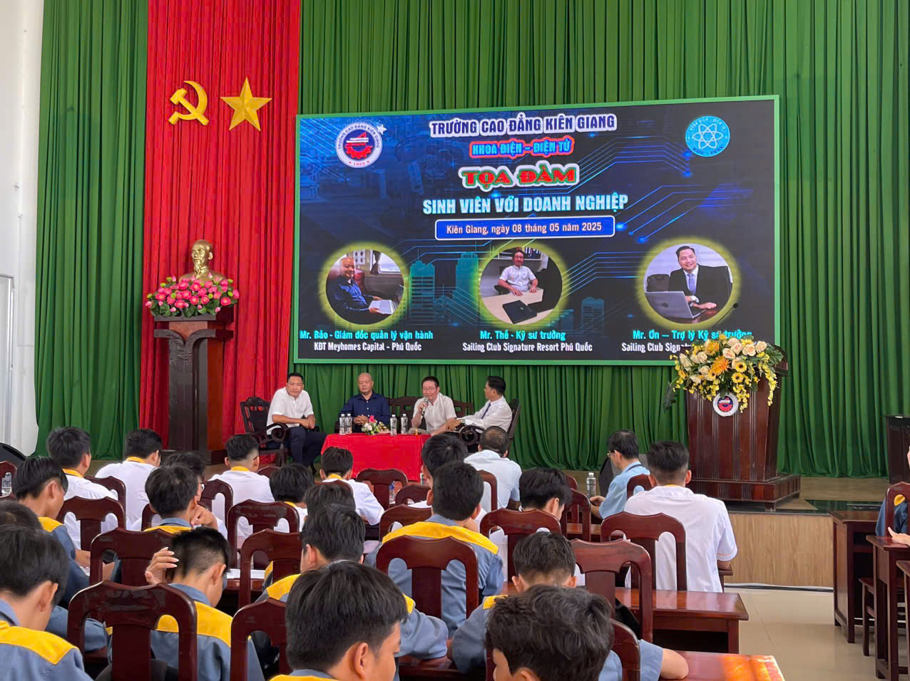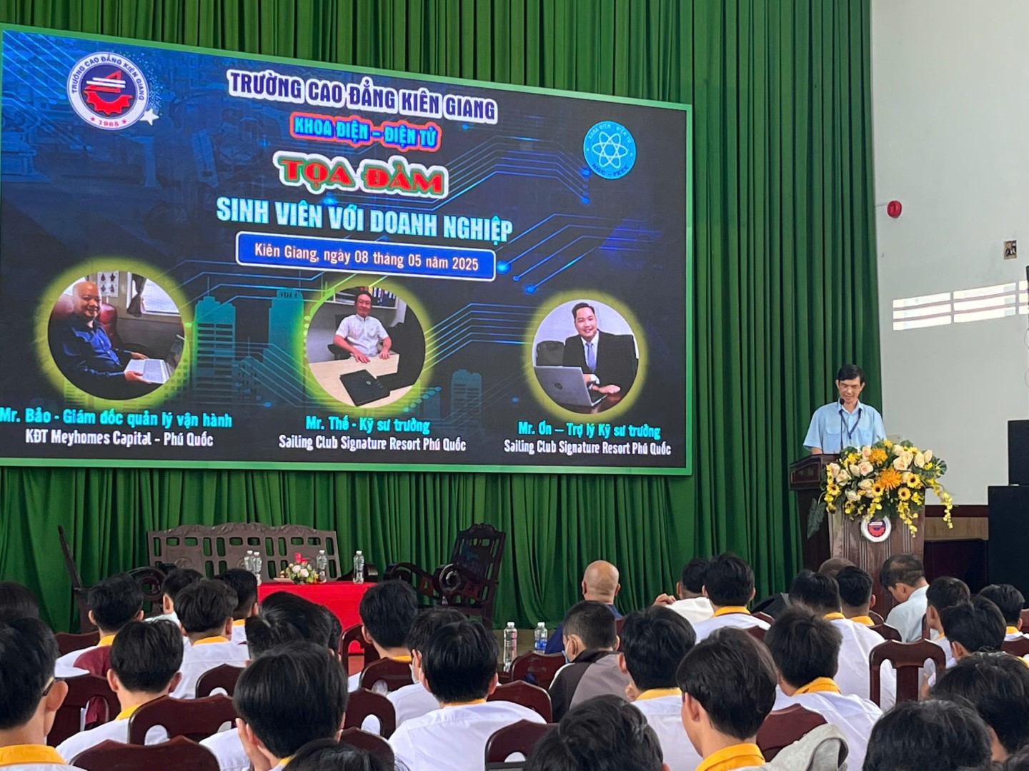 Vào ngày 8/5/2025, tại Hội trường cơ sở 425 Mạc Cửu, Khoa Điện – Điện tử đã tổ chức buổi tọa đàm “Kết nối Doanh nghiệp – Định hướng nghề nghiệp cho sinh viên”, thu hút hơn 200 bạn trẻ tham gia. Chương trình trân trọng chào đón 03 đại diện lãnh đạo các doanh nghiệp uy tín đến giao lưu và chia sẻ, đó là: Ông Ngô Đức Bảo - Giám đốc Quản lý vận hành khu đô thị Meyhomes Phú Quốc, Ông Nguyễn Văn Thế - Kỹ sư trưởng Sailing Club Signature Resort Phú Quốc và Ông Lâm Minh Ơn - Trợ lý Kỹ sư trưởng Sailing Club Signature Resort Phú Quốc.