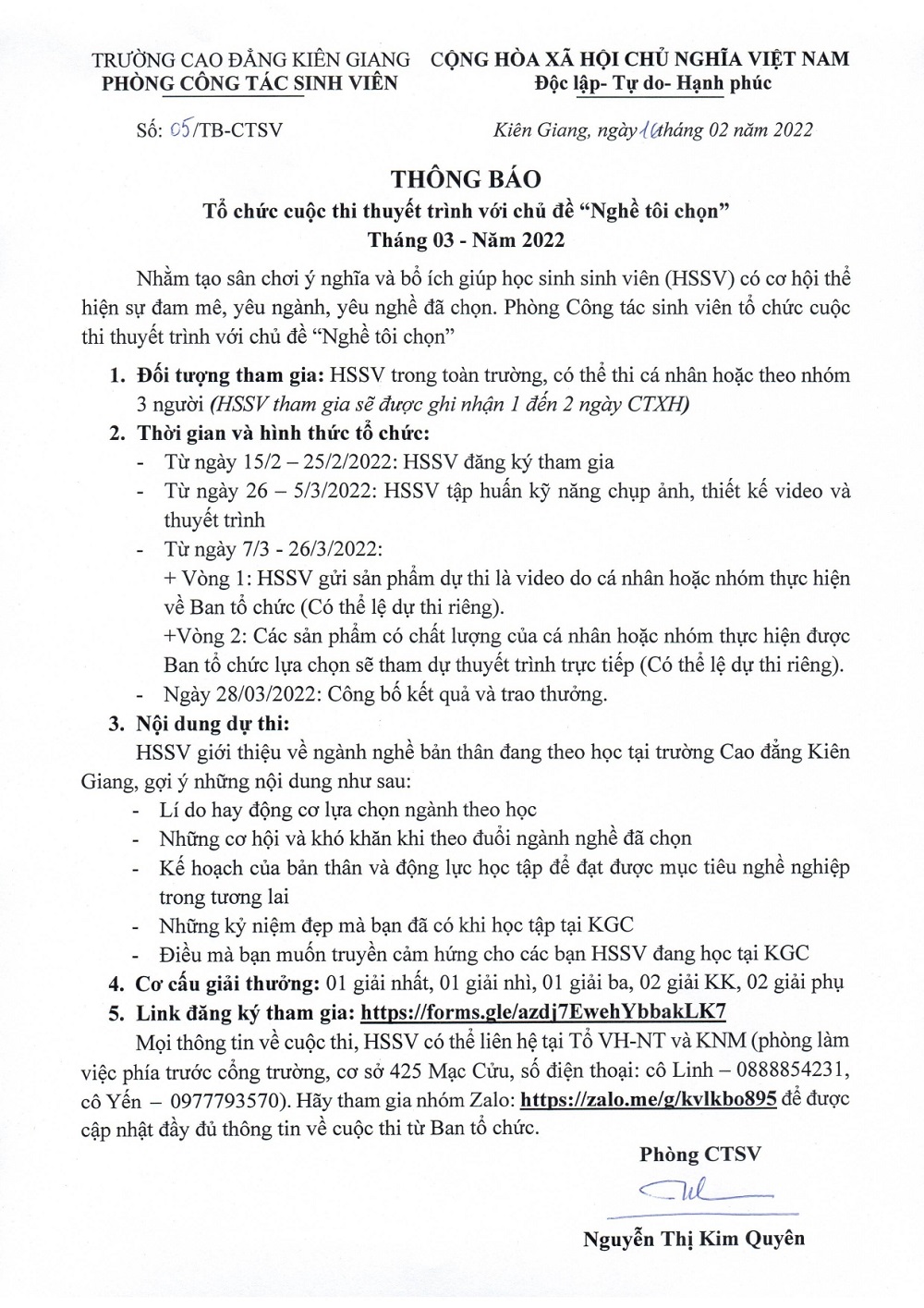 Thông báo tổ chức cuộc thi thuyết trình với chủ đề “Nghề tôi chọn” - Tháng 03 năm 2022