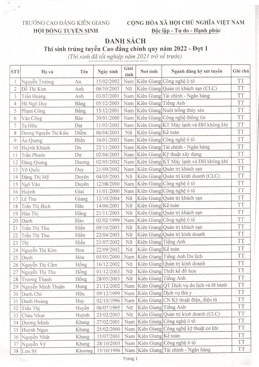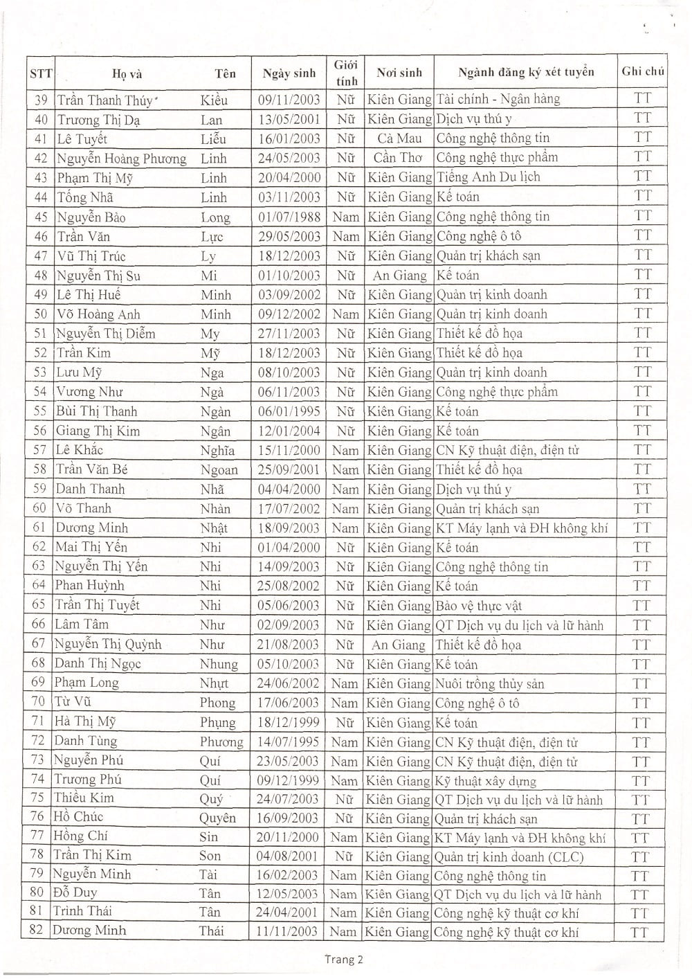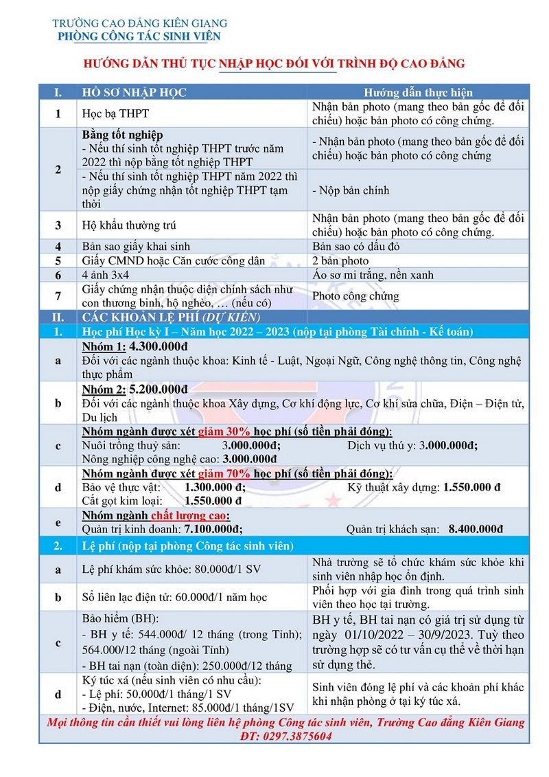 Trường Cao đẳng Kiên Giang mời các thí sinh đã tốt nghiệp THPT trước năm 2021 đến trường làm thủ tục nhập học tại 425 Mạc Cửu, TP. Rạch Giá.