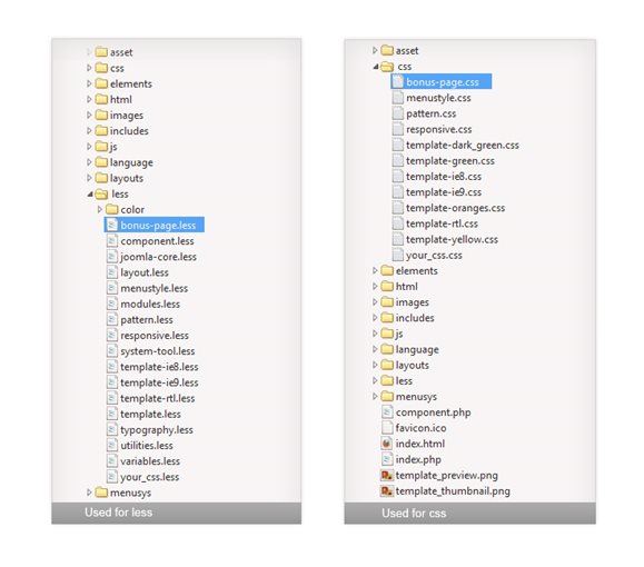 We use shortcodes to do the bonus pages, and css file dedicated for bonus pages is joomla-page.less(path: ROOT/templates/YOUR_TEMPLATE/less/joomla-page.less)