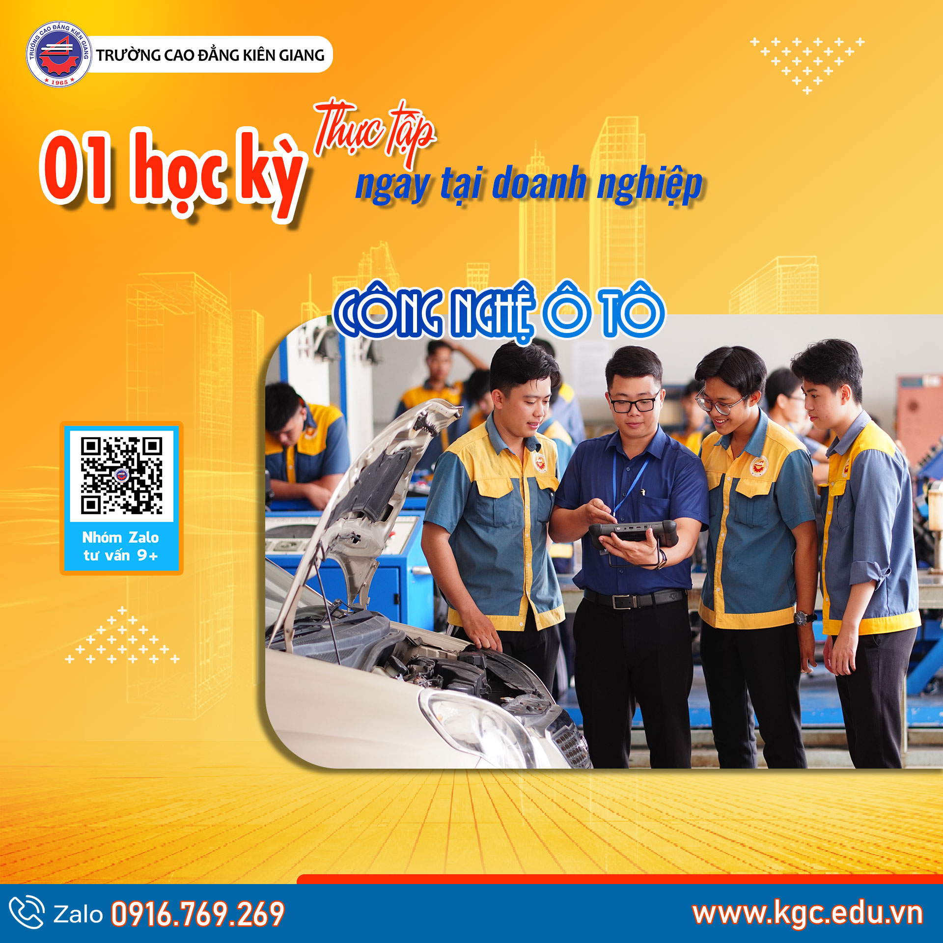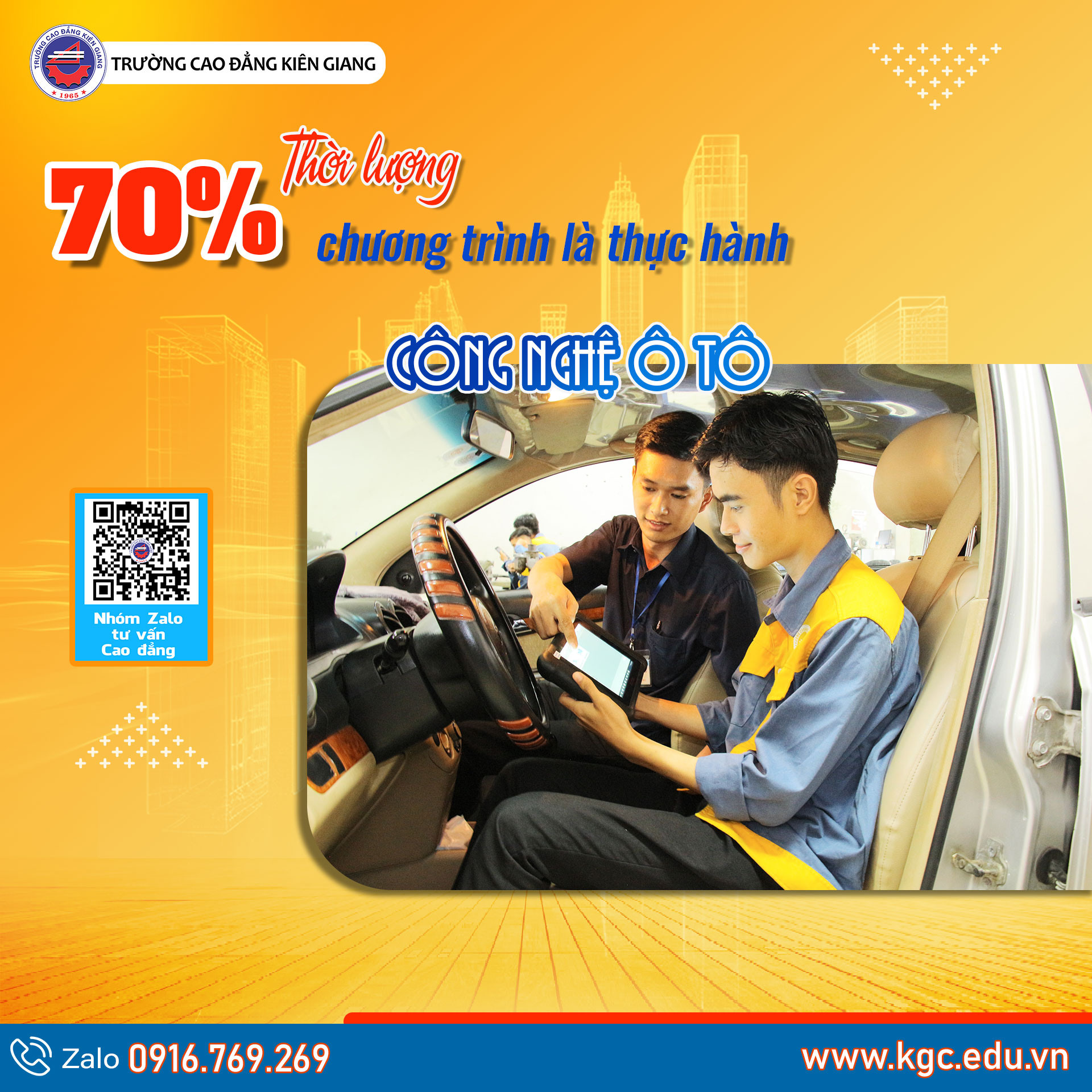 Với nhiều năm kinh nghiệm đào tạo và chất lượng đã được khẳng định, Trường Cao đẳng Kiên Giang mang đến chương trình đào tạo ngành Công nghệ ô tô bám sát nhu cầu thực tế của xã hội. Sinh viên sẽ được trang bị nền tảng kiến thức vững chắc cùng kỹ năng nghề hiện đại, giúp tự tin trở thành kỹ thuật viên chuyên nghiệp trong thời đại công nghệ phát triển không ngừng.
