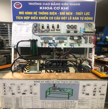 Hình 4. Ứng dụng công nghệ iot điều khiển mô hình điện khí nén, thủy lực tích hợp điều khiển cơ cấu đột lỗ bán tự động của tác giả Lê Quang Tâm, thuộc Khoa Cơ khí, Trường Cao đẳng Kiên Giang.