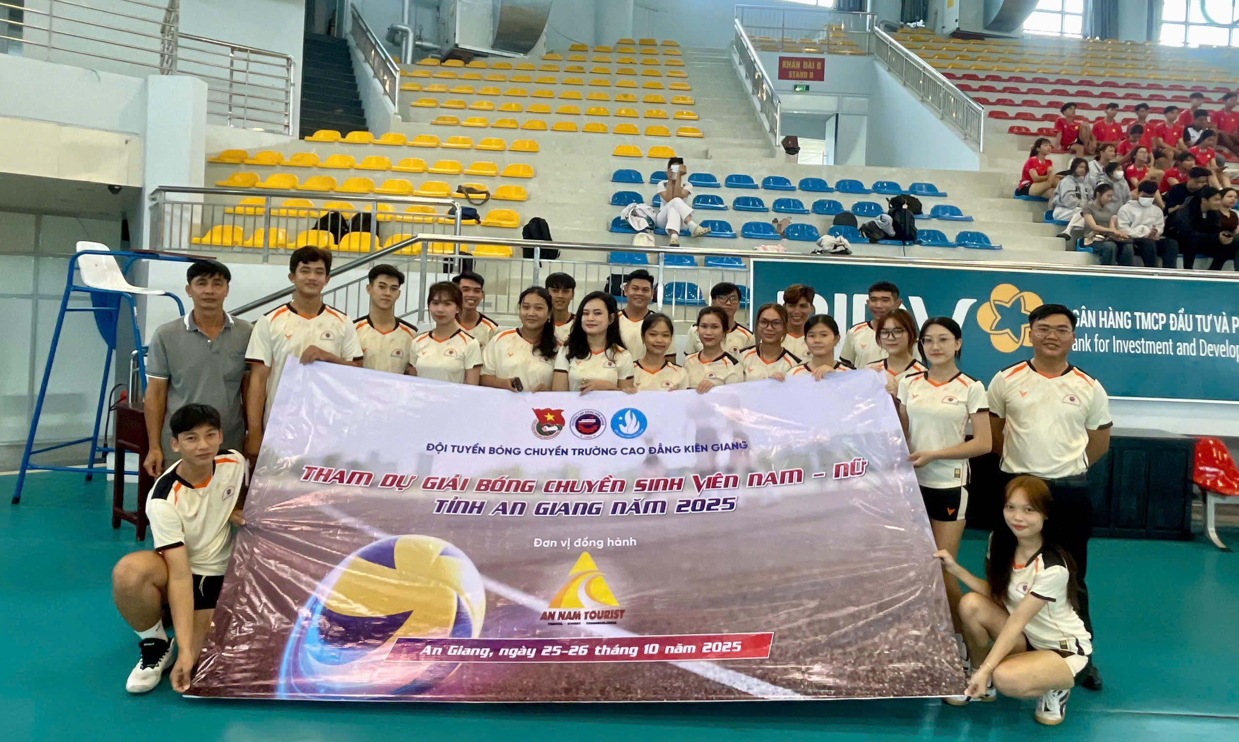 Trong hai ngày 25 và 26/10/2025, tại Nhà thi đấu đa năng tỉnh An Giang, Giải bóng chuyền Sinh viên Nam, Nữ tỉnh An Giang năm 2025 đã diễn ra sôi nổi với sự tham gia của các đội tuyển đến từ nhiều trường đại học, cao đẳng trong toàn tỉnh. Với tinh thần thi đấu “Đoàn kết – Trung thực – Cao thượng – Tiến bộ”, các vận động viên của Trường Cao đẳng Kiên Giang đã thi đấu hết mình, cống hiến nhiều pha bóng đẹp, thể hiện bản lĩnh và tinh thần thể thao đáng tự hào. Cùng với sự dẫn dắt của thầy Đoàn Đình Liệu, 2 đội bóng của trường đã mang về thành tích như sau: