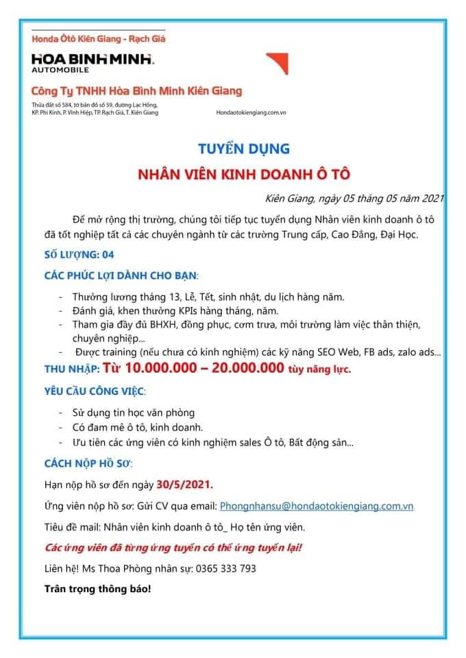 Công ty TNHH Hòa Bình Minh Kiên GIang - Honda Ô tô Kiên Giang tuyển dụng Nhân viên kinh doanh ô tô