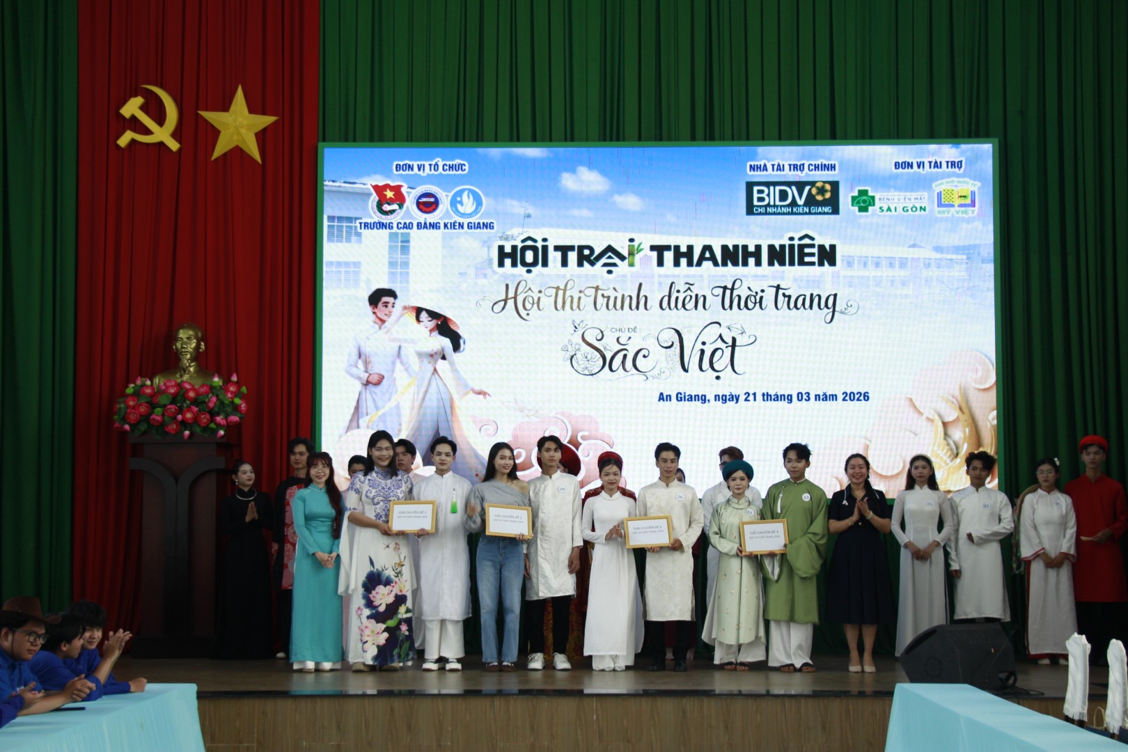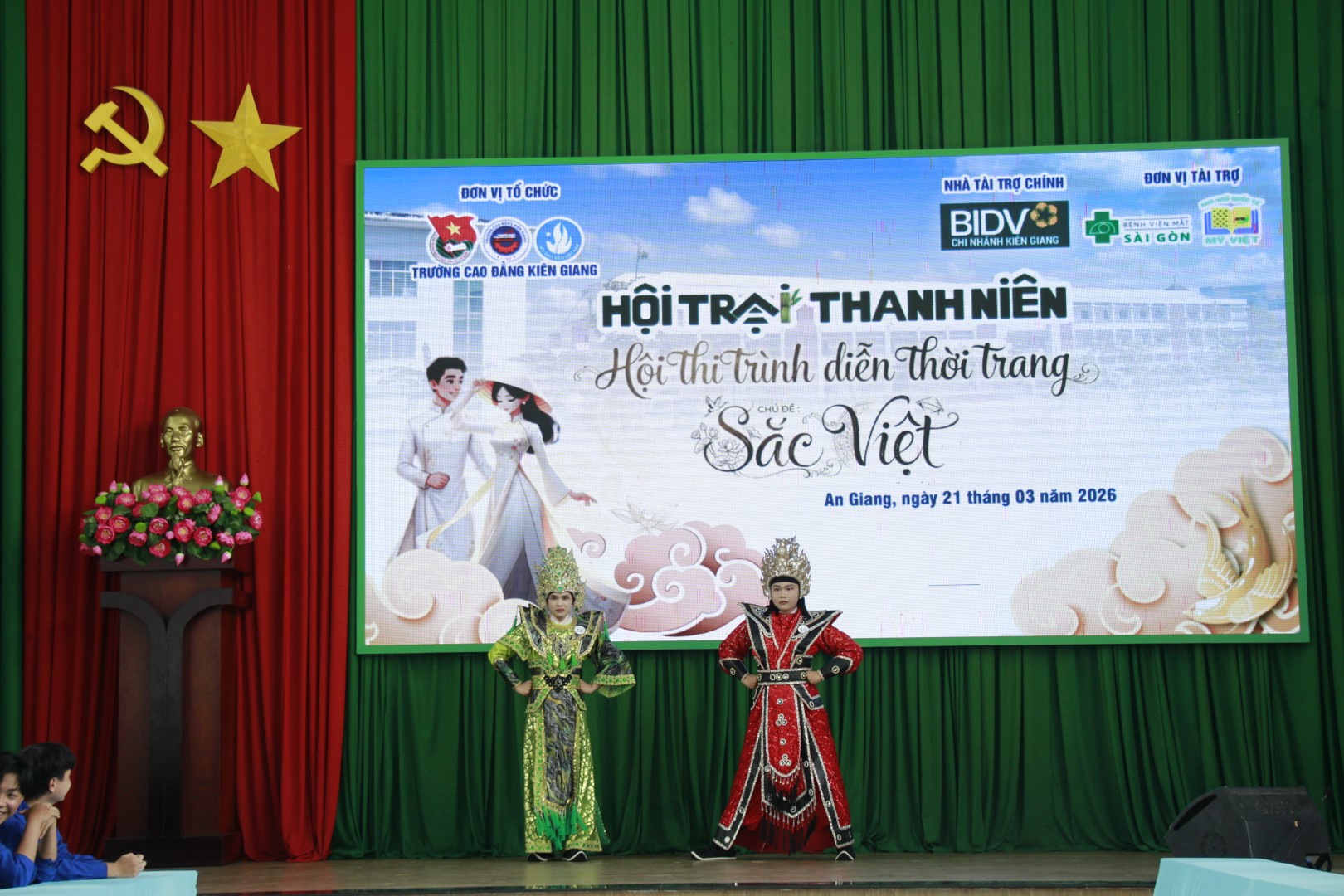 Hoà cùng không khí tưng bừng của chuỗi hoạt động trong Hội trại Thanh niên do Đoàn Thanh niên – Hội sinh viên Trường Cao đẳng Kiên Giang tổ chức vào ngày 21/3/2026. Hội thi trình diễn thời trang chủ đề “Sắc Việt” là một trong những điểm nhấn rực rỡ giữa rất nhiều sự tươi đẹp của tuổi trẻ Trường Cao đẳng Kiên Giang. Tham dự và chỉ đạo Hội thi có TS. Lê Trung Kiên – Phó bí thư thường trực Đảng ủy, phó hiệu trưởng nhà trường. Sau thời gian ngắn phát động, Hội thi có sự tham gia tranh tài của 20 thí sinh rất chất lượng về ngoại hình cũng như khả năng ứng xử, sự kiện thu hút trên 400 khán giả đến xem và cổ vũ trực tiếp.
