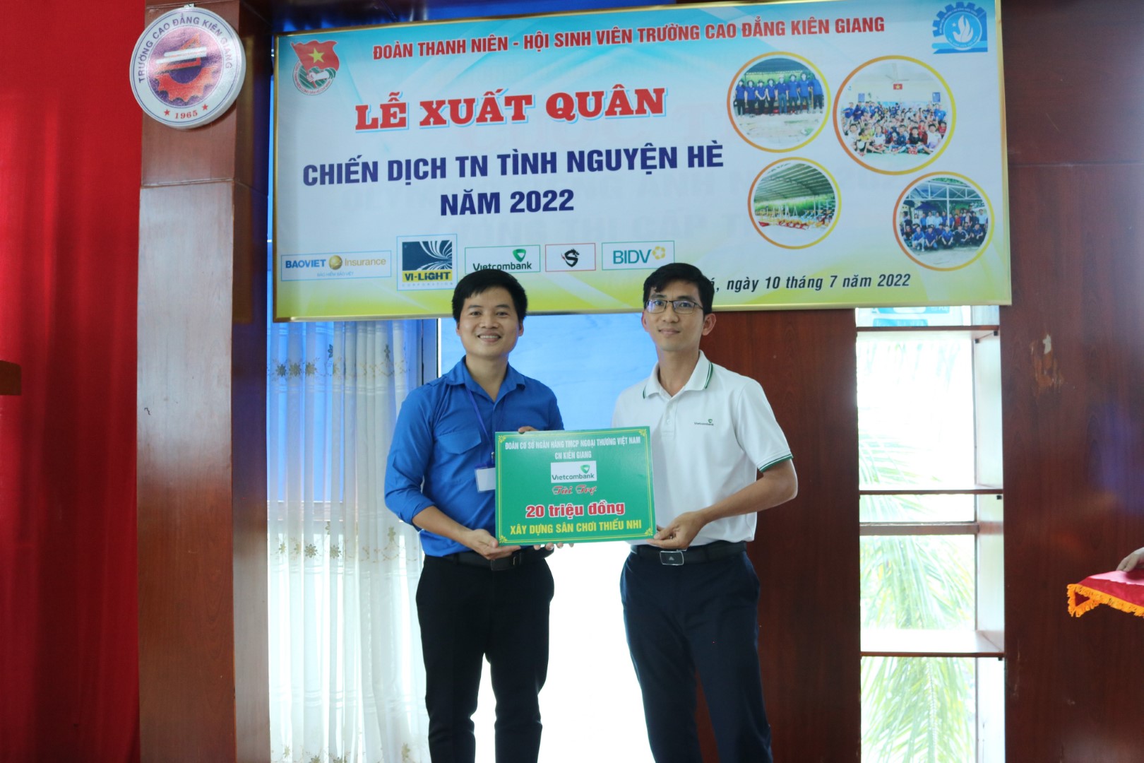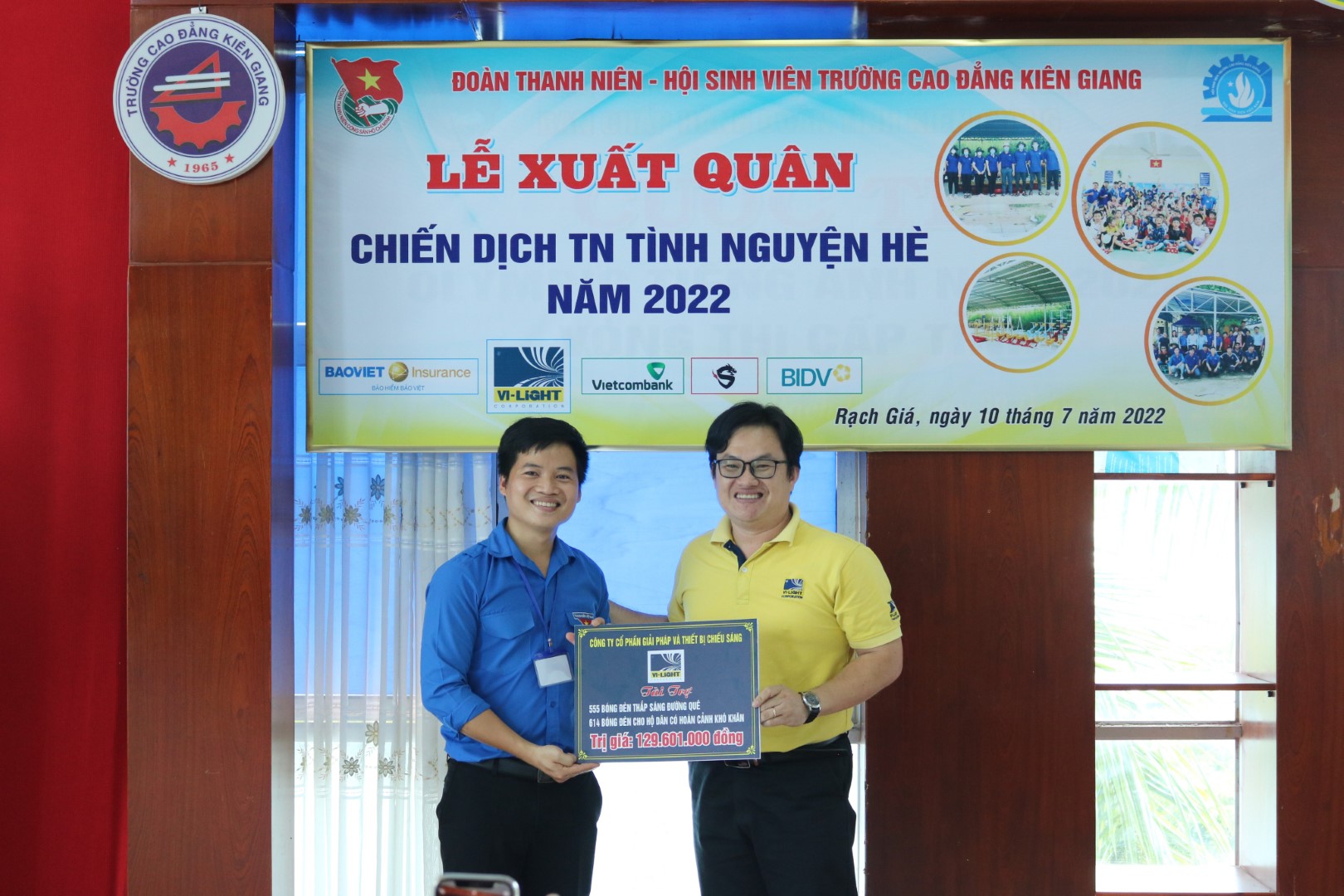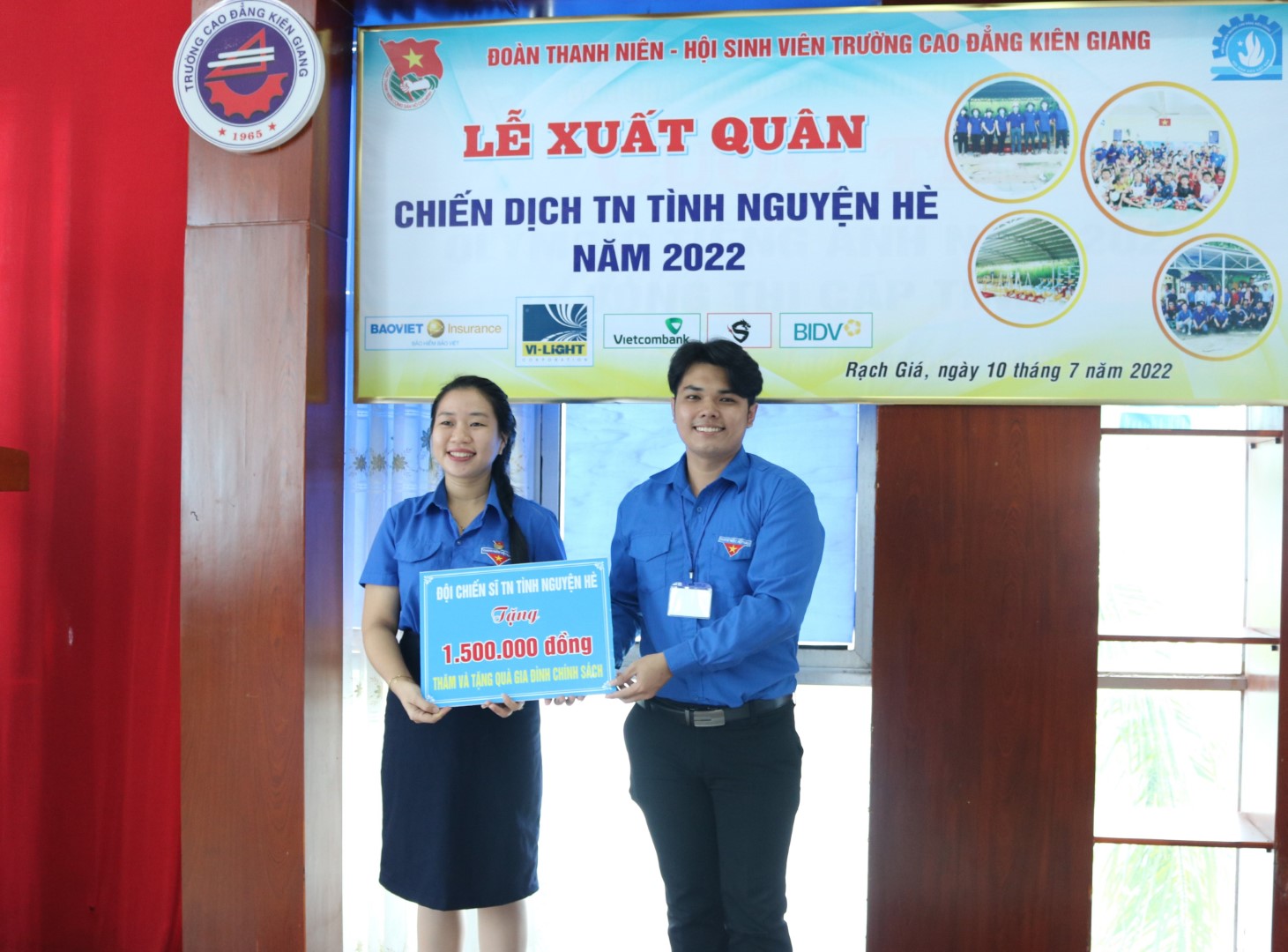 Chiến dịch Thanh niên tình nguyện hè năm 2022 được diễn ra chính tại mặt trận xã Tây Yên A, huyện An Biên, tỉnh Kiên Giang với sự tham gia của 15 chiến sĩ và 6 cán bộ giáo viên từ ngày 11/7 đến ngày 21/7/2022 và địa bàn huyện An Minh và Gò Quao, mỗi địa bàn sẽ diễn ra 01 ngày. Các chiến sĩ tình nguyện hè 2022 sẽ thực hiện các phần việc như: Thi công 01 công trình sân chơi cho thiếu nhi trị giá 20 triệu đồng tại điểm trường tiểu học tại xã Tây Yên A huyện An Biên, tỉnh Kiên Giang (Nguồn tài trợ: Đoàn Cơ sở Ngân hàng thương mại cổ phần Ngoại thương Việt Nam chi nhánh Kiên Giang); Thực hiện chương trình “Ánh sáng quê hương” với các phần việc trao tặng, lắp đặt 614 bóng đèn chiếu sáng cho các hộ gia đình khó khăn trong địa bàn xã Tây Yên A, huyện An Biên; lắp đặt 555 bóng đèn cho 05 công trình thắp sáng đường quê tại huyện An Biên, An Minh và Gò Quao (Nguồn tài trợ do công ty Cổ phần Giải pháp và Thiết bị chiếu sáng Vi – light) tổng trị giá 129.601.000 đồng; Tổ chức sinh hoạt hè cho thiếu nhi và tổ chức trao tặng 800 quyển tập trị giá 8 triệu đồng (Nguồn tài trợ: Ngân hàng TMCP Đầu tư & Phát triển Việt Nam - Chi nhánh Kiên Giang và Công ty TNHH Dịch vụ Du lịch & Sự kiện Đại Long Phú Quốc); Tổ chức thăm và tặng quà cho các hộ gia đình chính sách; Phối hợp thực hiện các phần việc khác tại địa phương như trồng cây xanh tại các tuyến đường giao thông nông thôn, tuyên truyền vận động xây dựng nông thôn mới, bảo vệ môi trường; Đoàn trường - Hội sinh viên trường còn đóng góp 6 triệu đồng cho Cụm Đoàn trường học để xây dựng 1 căn nhà nhân ái năm 2022. Bên cạnh đó, Đội thanh niên tình nguyện hè 2022 trường Cao đẳng Kiên Giang cònnhận được sự tài trợ từ Công ty Bảo Việt Kiên Giang trị giá 5 triệu đồng cho các hoạt động trong Chiến dịch như thăm và tặng quà cho gia đình chính sách, tổ chức sinh hoạt thiếu nhi và các hoạt động của đội.