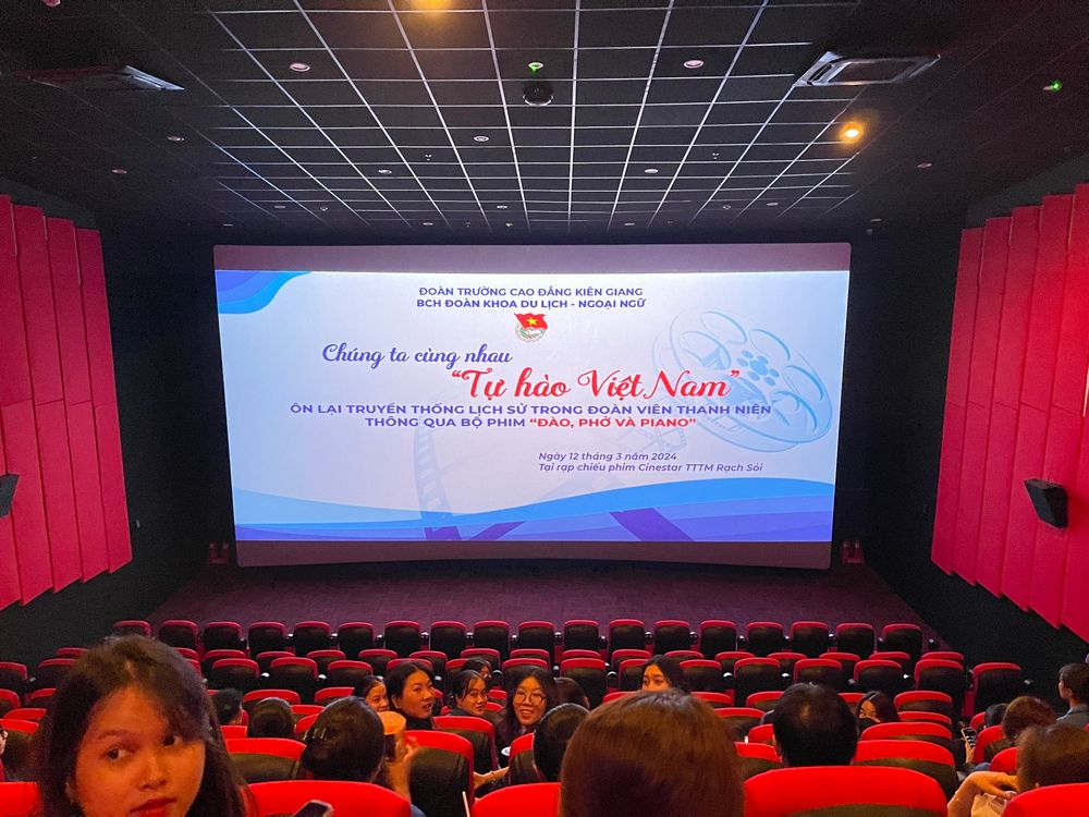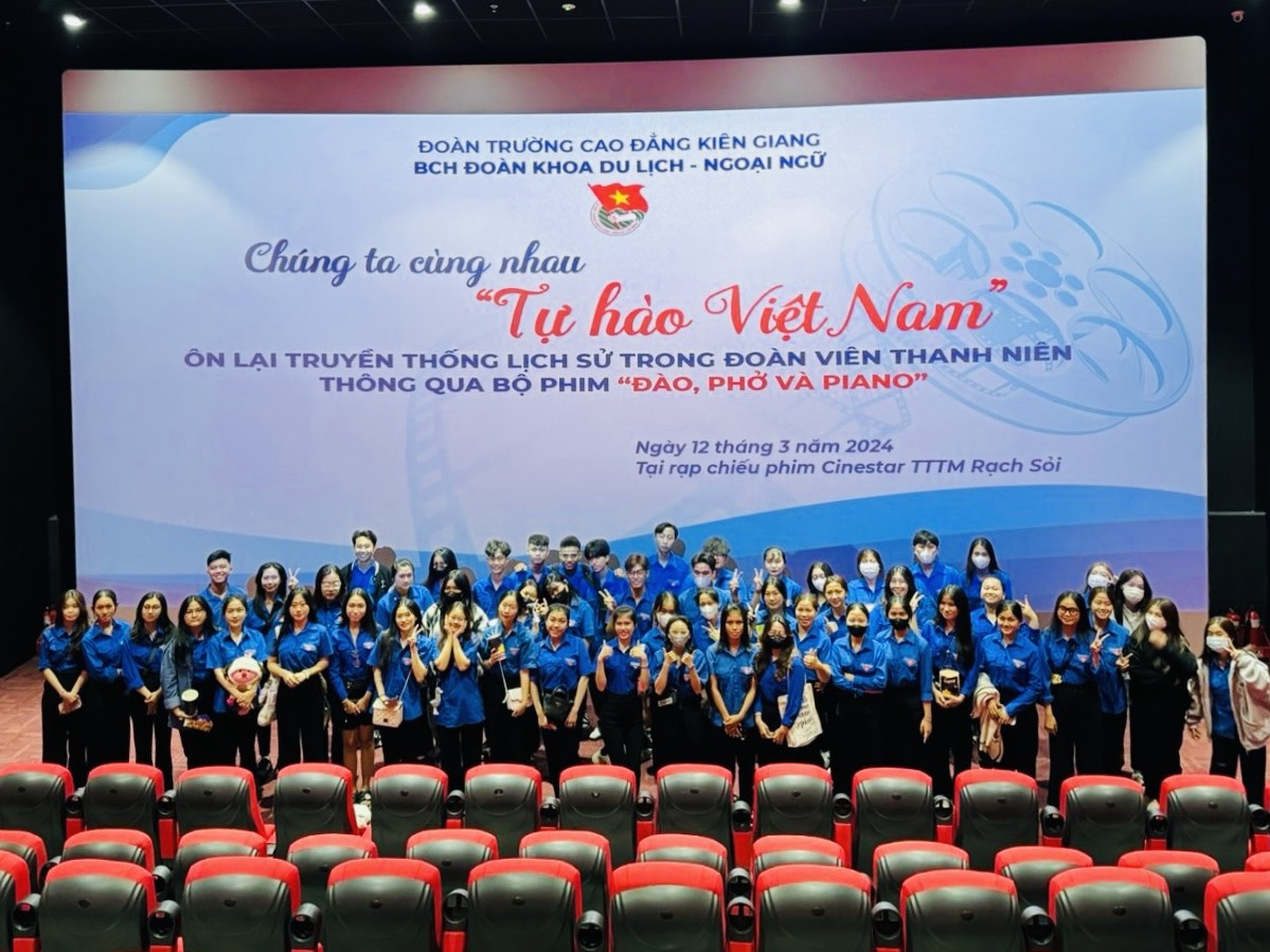 Căn cứ theo Kế hoạch số 95-KH/ĐTN ngày 27/02/2024 của Đoàn trường Cao đẳng Kiên Giang về việc Tổ chức các hoạt động kỷ niệm 93 năm ngày thành lập Đoàn TNCS Hồ Chí Minh và kế hoạch số 02-KH/ĐTN ngày 05/3/2024 của Đoàn khoa Du lịch – Ngoại ngữ, tối ngày 12/3/2024, tại Rạp chiếu phim Cinestar (TTTM Rạch Sỏi, Rạch Giá), Đoàn khoa Du lịch - Ngoại ngữ đã vận động tổ chức tuyên truyền lịch sử, giáo dục truyền thống của thế hệ trước thông qua Bộ phim “Đào, Phở và Piano” nhân kỷ niệm 93 năm Ngày thành lập Đoàn TNCS Hồ Chí Minh (26/3/1931 - 26/3/2024) với sự có mặt của đ/c Lê Thị Thu Nhã – Bí thư Đoàn khoa; đ/c Trần Thanh Trung – Phó Bí thư Đoàn khoa; các đ/c UV.BCH Đoàn khoa và sự góp mặt của hơn 60 đồng chí là đoàn viên của các chi đoàn trực thuộc Đoàn khoa Du lịch – Ngoại ngữ.