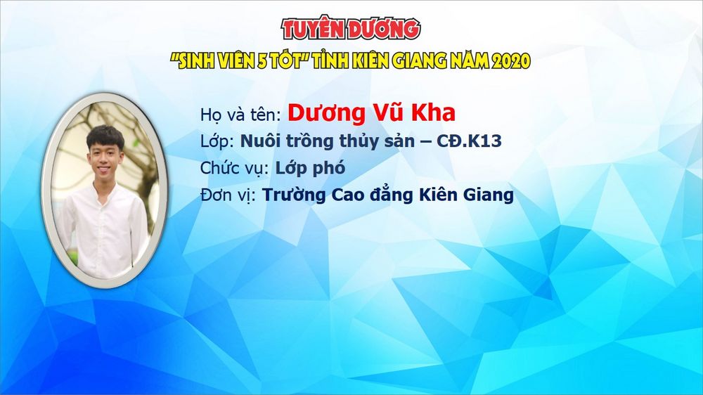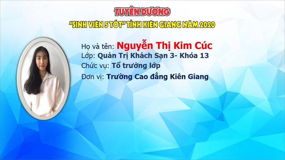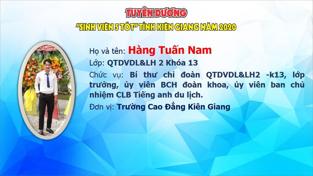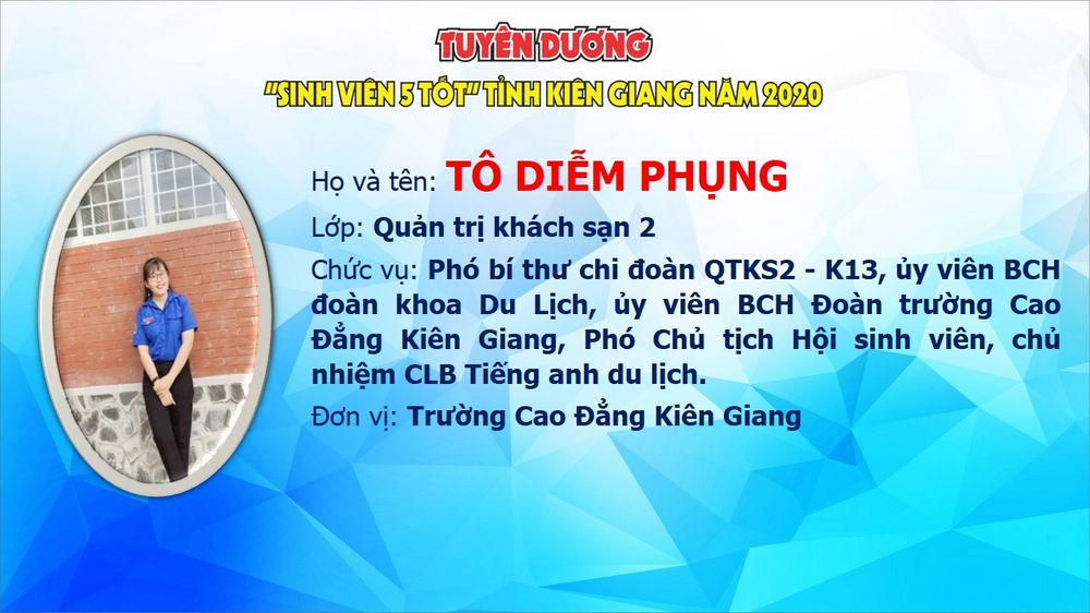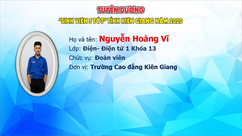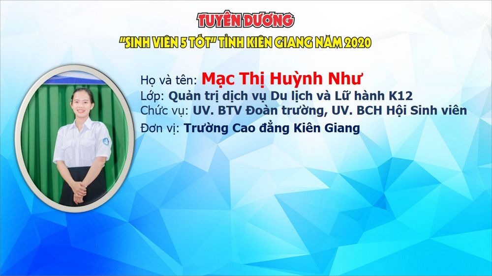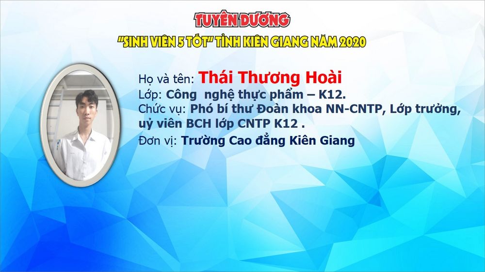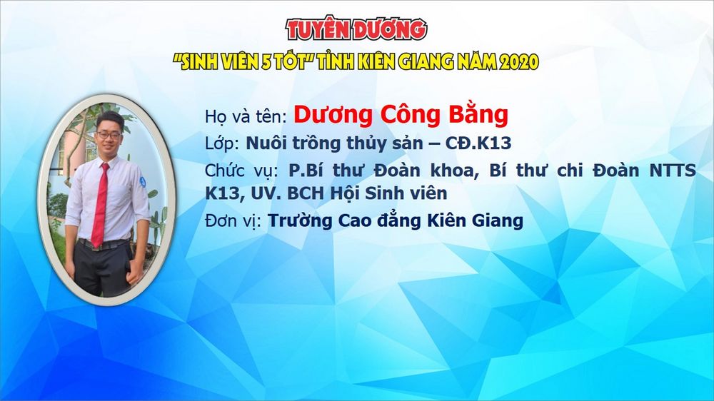 Trong năm học 2019 - 2020, BCH Tỉnh đoàn Kiên Giang đã vinh danh 32 sinh viên đạt danh hiệu “Sinh viên 5 tốt” và 02 tập thể đạt “Tập thể sinh viên 5 tốt” cấp tỉnh, trong đó Trường Cao đẳng Kiên Giang có 13 sinh viên và 02 tập thể được vinh danh. Đây là kết quả của sự phấn đấu không ngừng nghỉ của các cá nhân và tập thể để đạt được danh hiệu cao quý trong thời sinh viên của mình.