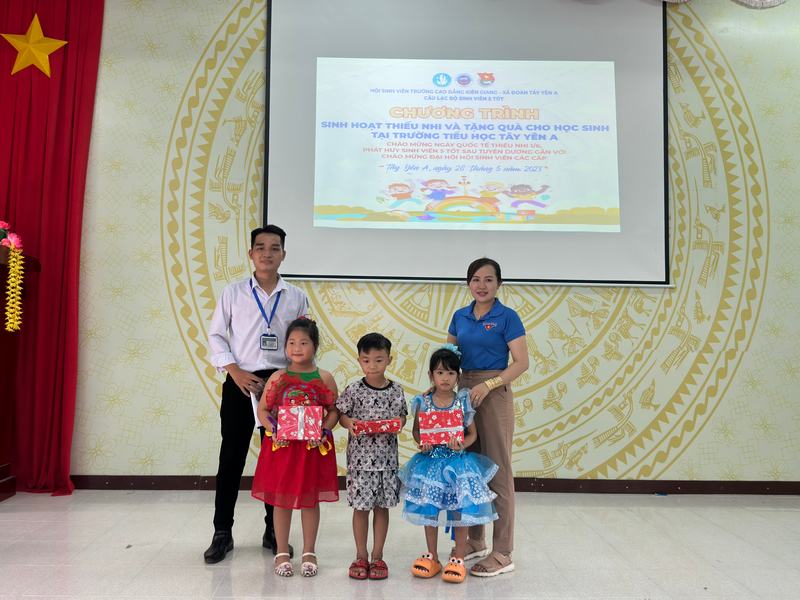 Vào ngày 28/5/2023, tại hội trường Uỷ ban nhân dân xã Tây Yên A (xã Tây Yên A, huyện An Biên, tỉnh Kiên Giang), Câu lạc bộ Sinh viên 5 tốt trường Cao đẳng Kiên Giang đã phối hợp Xã Đoàn Tây Yên A tổ chức sinh hoạt thiếu nhi và tặng quà cho học sinh trường Tiểu học Tây Yên A. Chương trình được thực hiện nhằm chào mừng ngày Quốc tế Thiếu nhi và phát huy sinh viên 5 tốt sau tuyên dương gắn với chào mừng Đại hội Hội sinh viên các cấp.