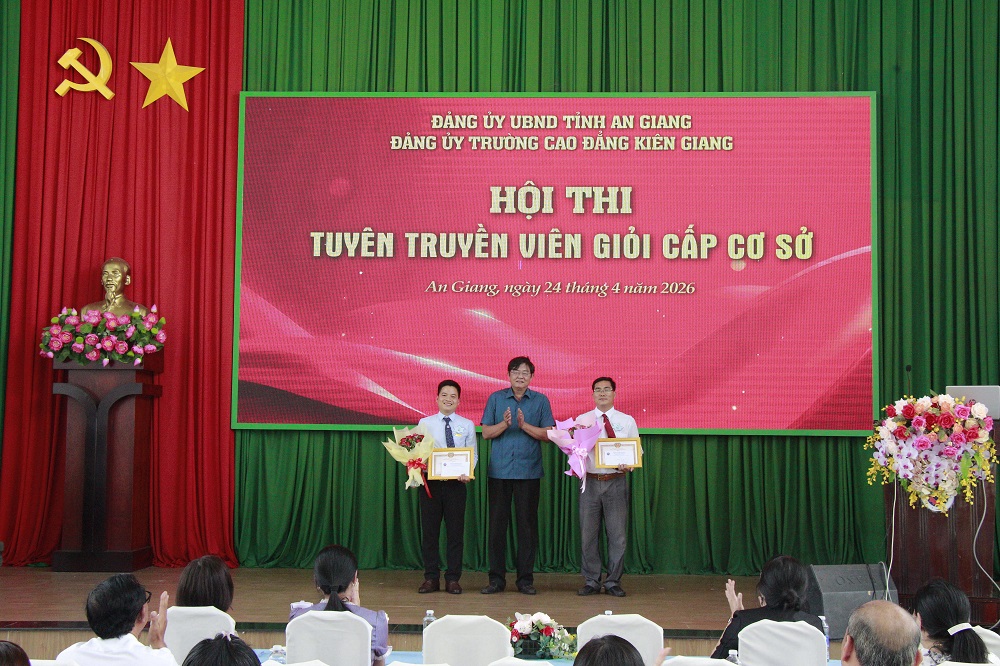 Đ/c Nguyễn Minh Quân - Bí thư Đảng ủy Trường Cao đẳng Kiên Giang trao giải Nhất cho đồng chí Nguyễn Văn Tuấn Vũ và giải Nhì cho đồng chí Trần Thanh Lâm