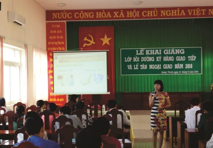 Kỹ năng giao tiếp luôn được xem là yếu tố then chốt ảnh hưởng đến sự phát triển toàn diện của một người, dù là trong công việc hay các mối quan hệ riêng tư. Đặc biệt là đối với các cán bộ viên chức, những người giữ vai trò quan trọng trong các đơn vị hành chính sự nghiệp, thường xuyên phải tiếp xúc và trao đổi với người dân trong quá trình công tác, thì việc trang bị kỹ năng giao tiếp là một phần không thể thiếu để chất lượng công việc được hoàn thiện hơn. Ngoài ra, việc nắm vững các kiến thức về lễ tân trong giao tiếp đối ngoại cũng vô cùng cần thiết, giúp thể hiện tính chuyên nghiệp cho người cán bộ viên chức trong thời đại mới. Hiểu được nhu cầu đó, vào ngày 14/11/2016, trường Cao đẳng Kinh tế - Kỹ thuật Kiên Giang đã phối hợp cùng phòng Nội vụ huyện Giang Thành khai giảng khóa Kỹ năng giao tiếp và Lễ tân Ngoại giao dành cho các cán bộ nhằm nâng cao chất lượng nguồn nhân lực của huyện.
