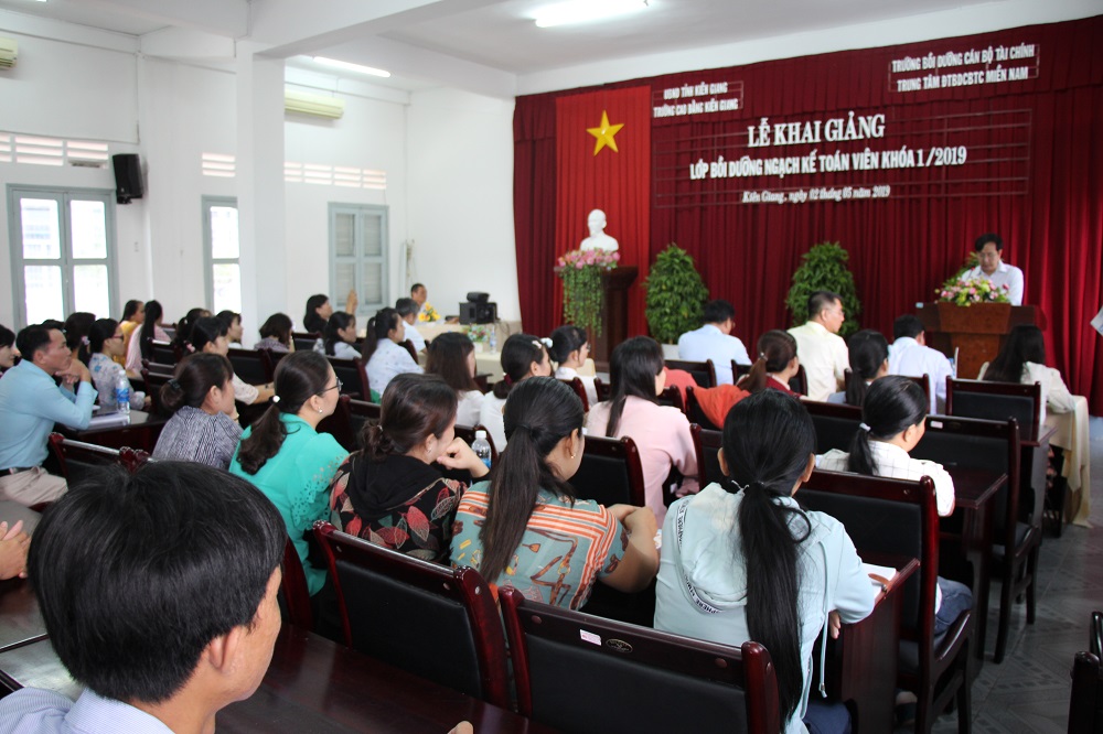 Nhằm tổ chức buổi lễ trang trọng để chào đón 72 học viên lớp Bồi dưỡng ngạch Kế toán viên của của Trung tâm Đào tạo Bồi dưỡng Cán bộ Tài chính Miền Nam thuộc trường Bồi dưỡng Cán bộ Tài chính, đồng thời nhằm tạo sự gắn kết tốt đẹp giữa hai trường, sáng ngày 02/5/2019, trường Bồi dưỡng Cán bộ Tài chính cùng phối hợp với trường Cao đẳng Kiên Giang tổ chức Lễ Khai giảng lớp Bồi dưỡng ngạch Kế toán viên khóa 1/2019.