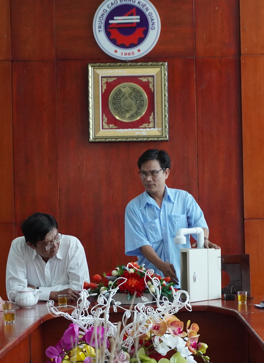 Thầy Nguyễn Văn Sáng - giáo viên khoa Điện-Điện tử giới thiệu máy rửa tay sát khuẩn tự động trong buổi họp