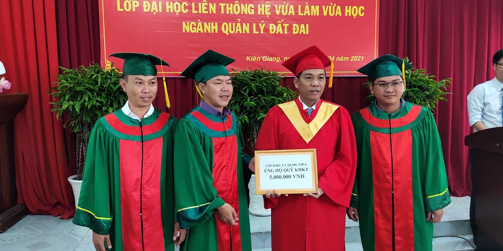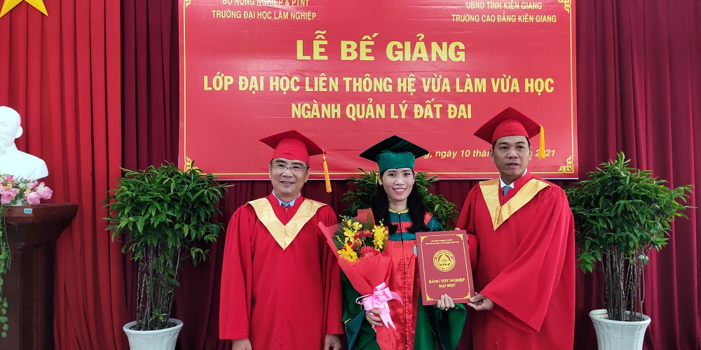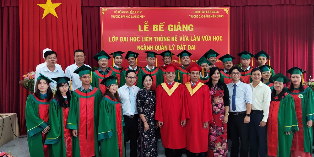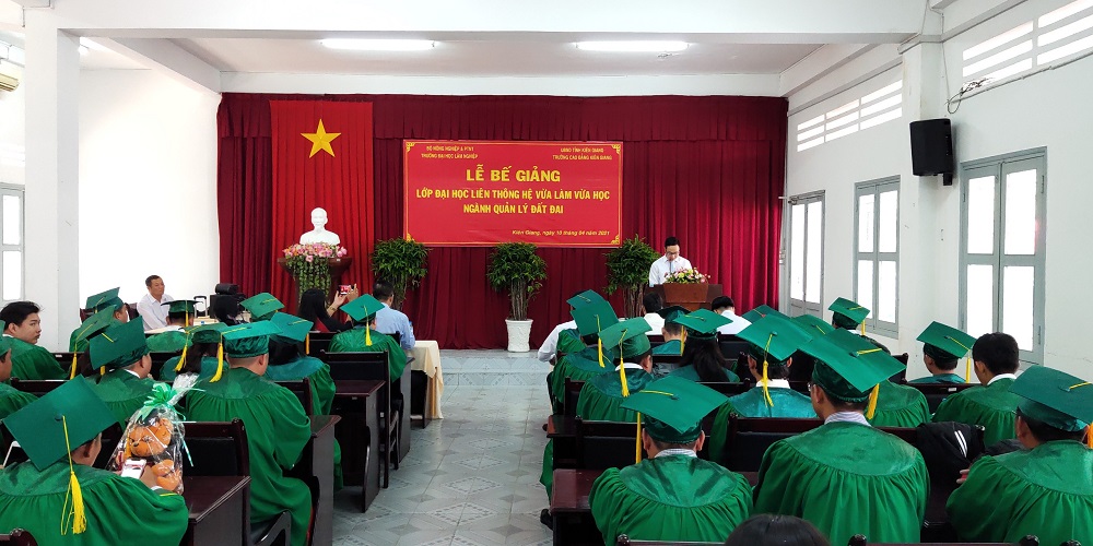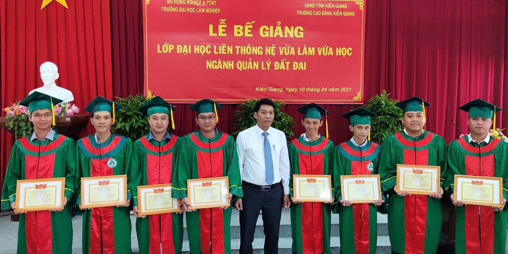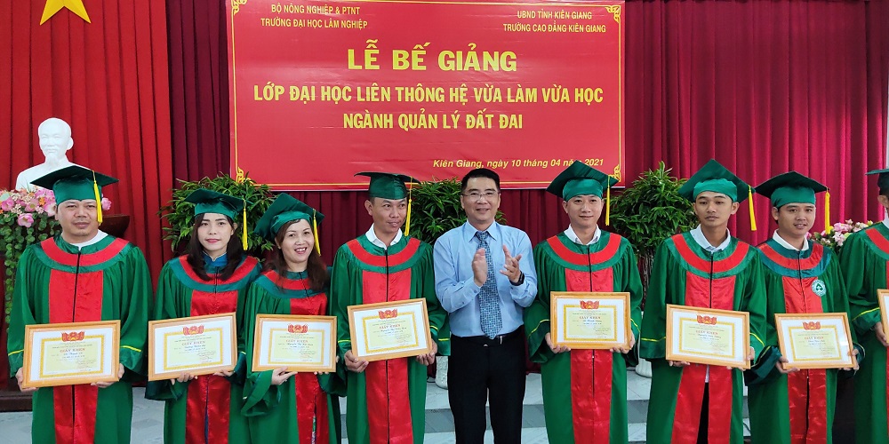 Nhằm tổng kết khoá học, công bố quyết định, công nhận hoàn thành khóa học cho 32 học viên lớp Quản lý đất đai, ngày 10/4/2021, Phân hiệu trường Đại học Lâm Nghiệp tại tỉnh Đồng Nai cùng phối hợp với trường Cao đẳng Kiên Giang long trọng tổ chức Lễ Bế giảng Lớp Quản lý đất đai tại cơ sở 217 Chu Văn An, TP Rạch Giá, Kiên Giang. Trong thời gian học tập và gắn bó tại trường vừa qua, các anh/chị đã không ngừng nỗ lực, phấn đấu để hoàn thành khoá học của mình với kết quả khả quan và đạt nhiều thành tích đáng biểu dương.