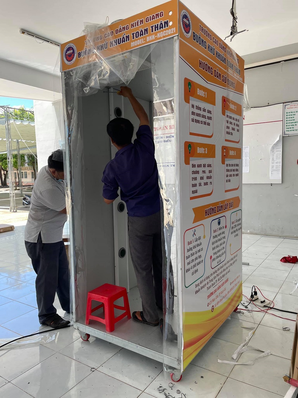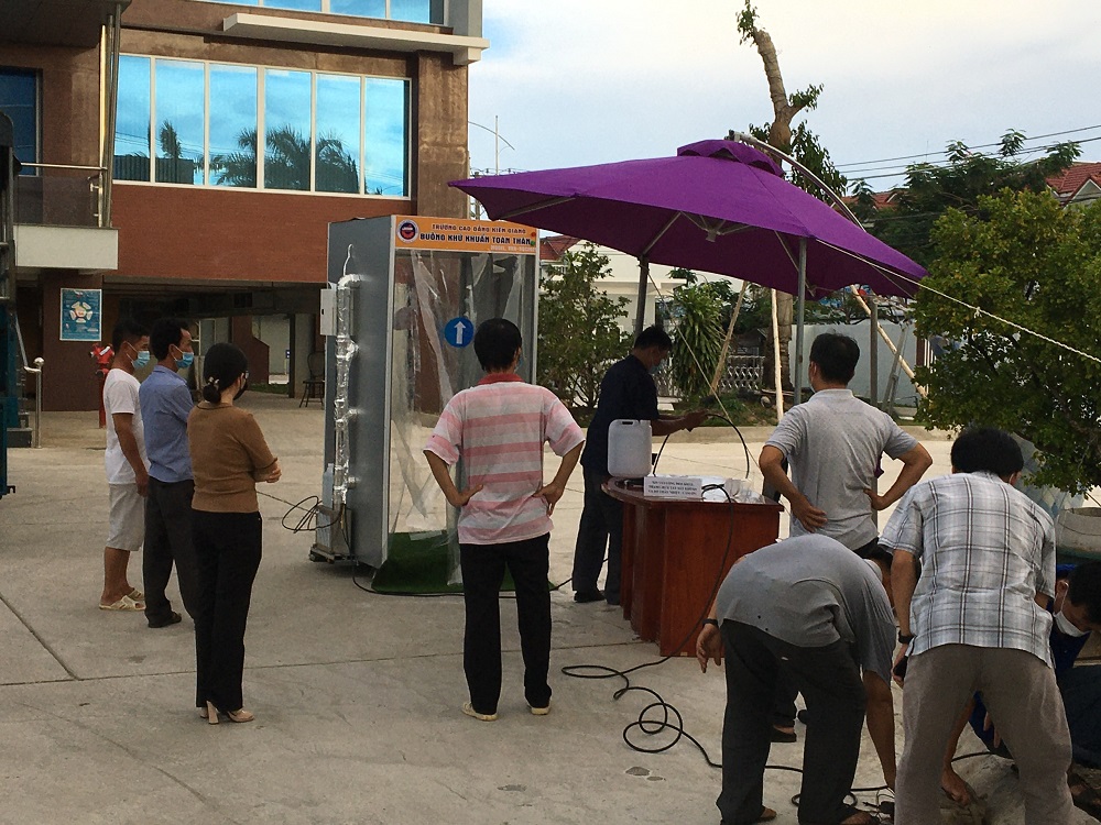 Ngày 26-27/6/2021, Trường Cao đẳng Kiên Giang tiếp tục sản xuất thêm 02 Buồng khử khuẩn toàn thân cung cấp cho Sở Nông nghiệp và Phát triển Nông thôn Kiên Giang để phục vụ cho công tác phòng, chống dịch COVID-19. Tính đến nay nhà trường đã sản xuất 11 Buồng khử khuẩn toàn thân hỗ trợ cho các đơn vị và doanh nghiệp trong tỉnh nhằm ngăn chặn sự lây lan của dịch bệnh COVID-19 trong cộng đồng.