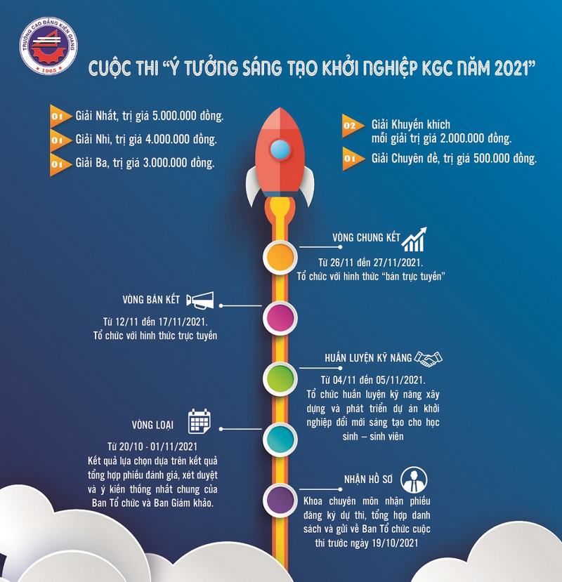 Trường Cao đẳng Kiên Giang đã phát động Cuộc thi "Ý tưởng sáng tạo khởi nghiệp KGC năm 2021" từ ngày 06/10/2021. Đến thời điểm này, Ban Tổ chức cuộc thi đã lựa chọn được 40 ý tưởng, dự án khởi nghiệp của học sinh, sinh viên từ các khoa chuyên môn vào thi vòng bán kết.