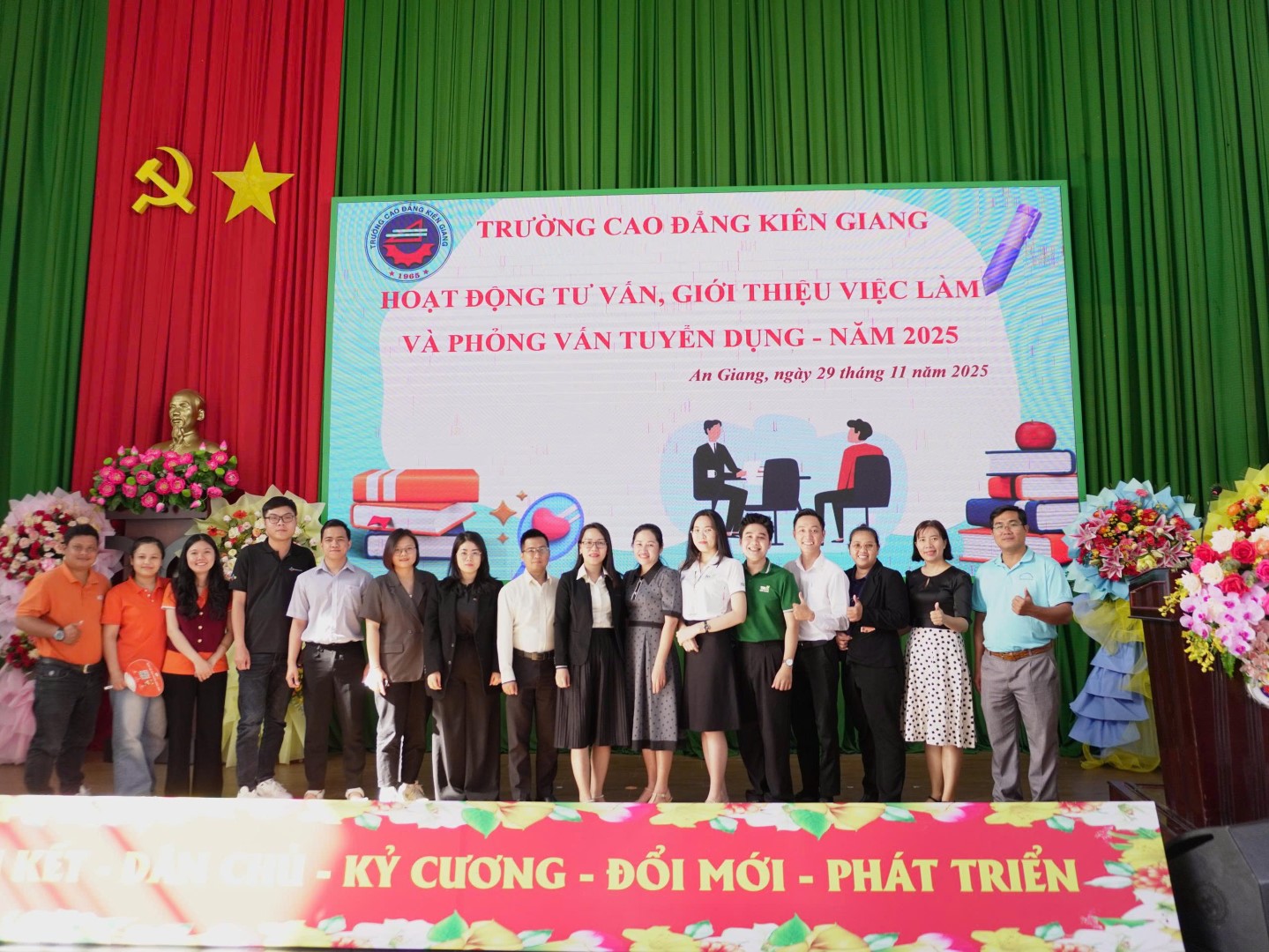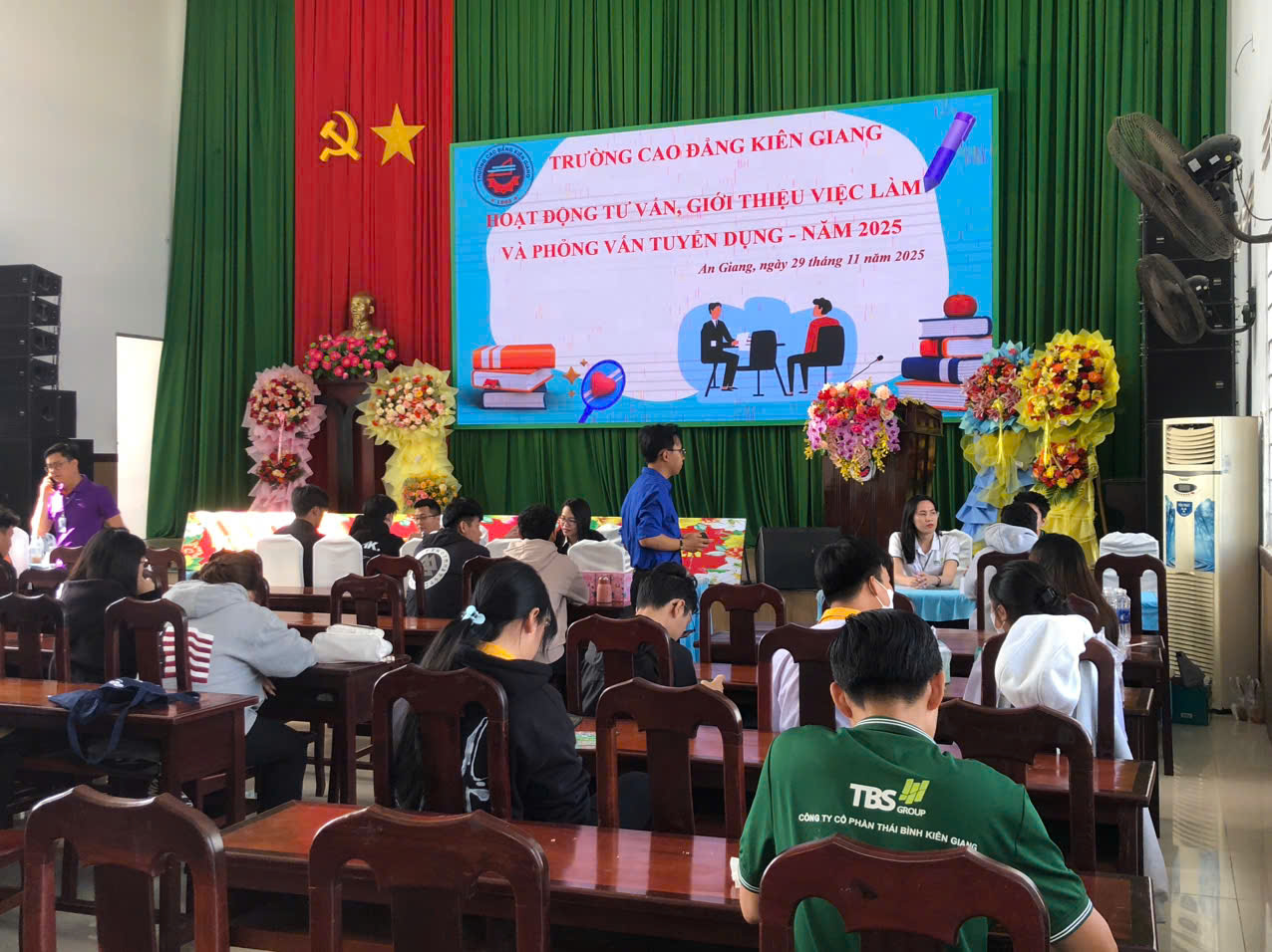 Sáng ngày 29/11/2025, Trường Cao đẳng Kiên Giang đã tổ chức thành công hoạt động Tư vấn, giới thiệu việc làm và phỏng vấn tuyển dụng năm 2025. Chương trình thu hút sự tham gia của các doanh nghiệp uy tín trong khu vực như: Công ty Thaco Auto An Giang, Chi nhánh Kiên Giang - Công ty cổ phần viễn thông FPT, Công ty cổ phần Thái Bình Kiên Giang, Công ty CJ Vina Agri và gần 200 sinh viênsắp tốt nghiệp của nhà trường, tạo nên một không khí kết nối nghề nghiệp đầy hứng khởi.