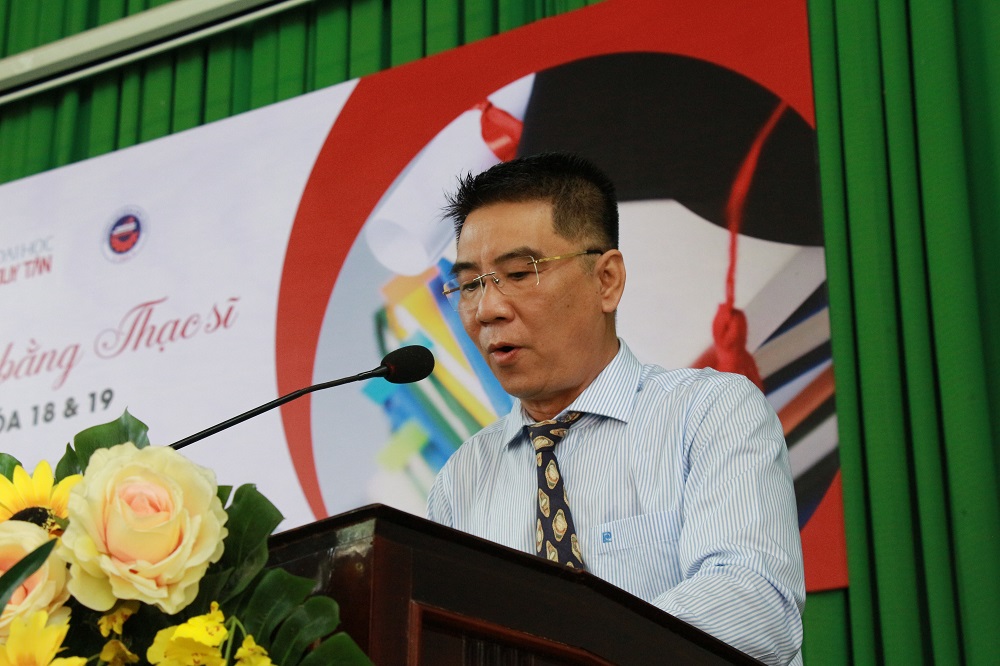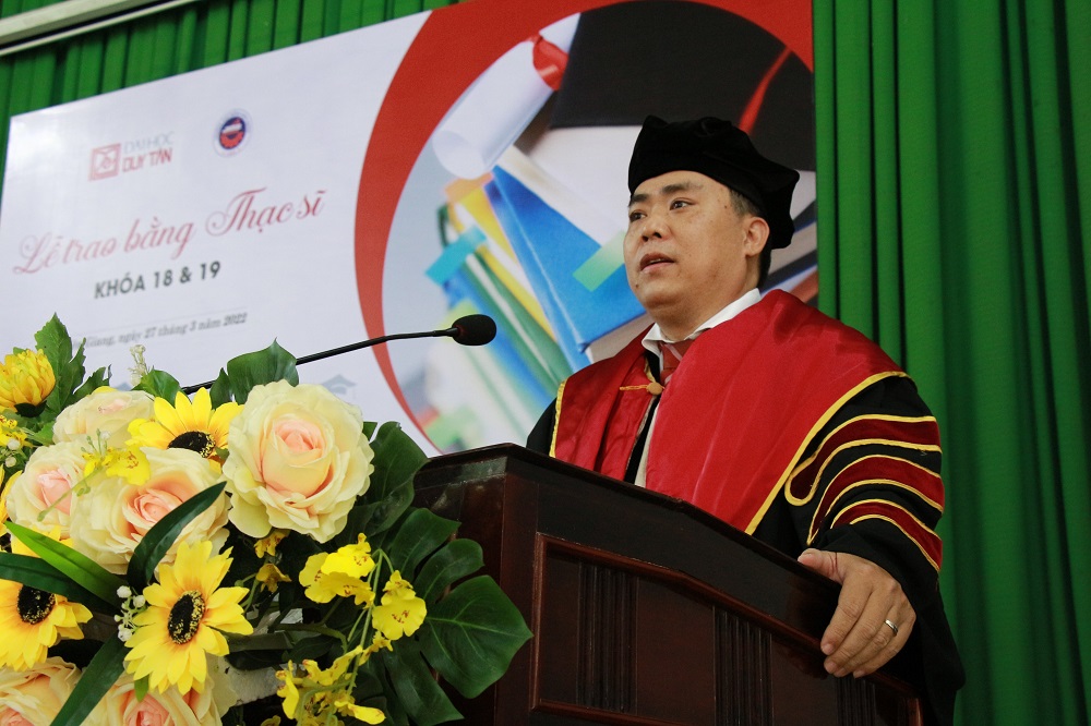 Tiến sĩ Võ Thanh Hải - Phó Hiệu trưởng thường trực trường Đại học Duy Tân phát biểu chúc mừng nhân buổi Lễ Trao bằng Thạc sĩ