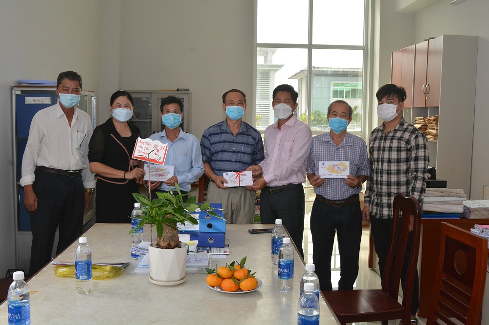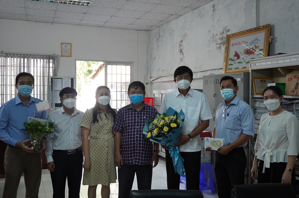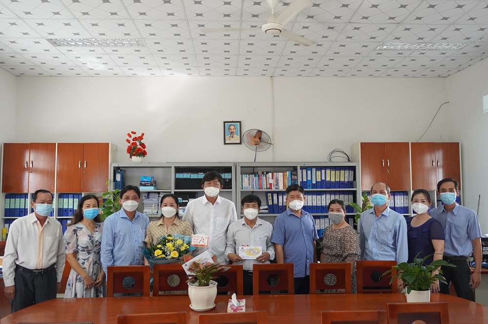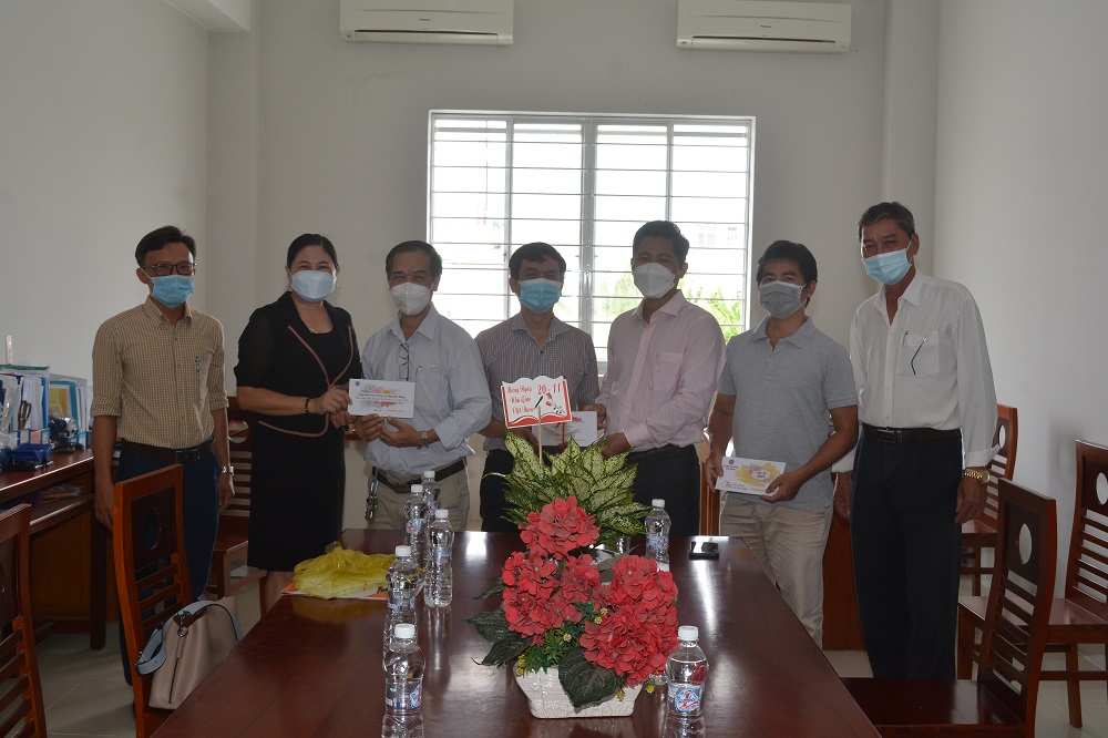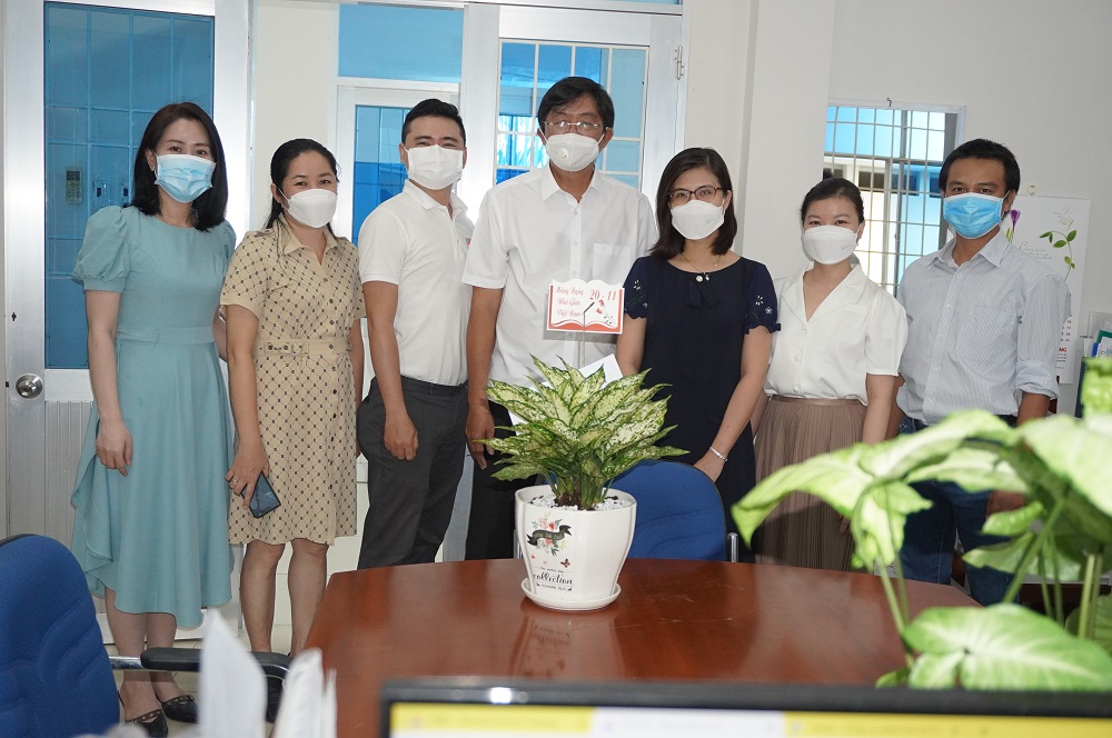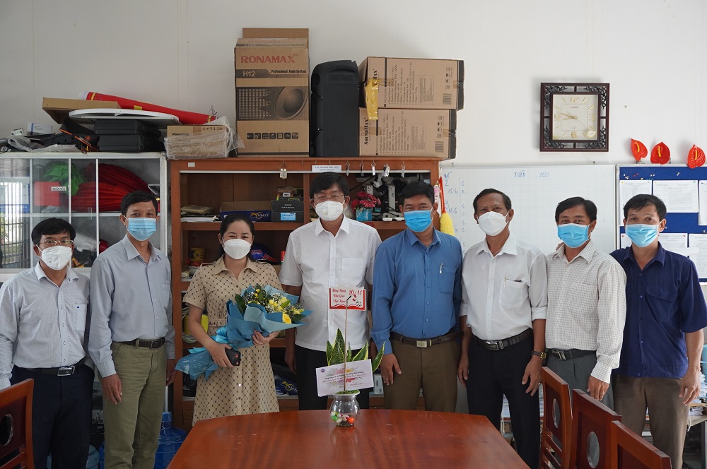 Thầy Lê Trung Kiên - Phó Hiệu trưởng, đại diện Ban Giám hiệu nhà trường gửi hoa và Thư chúc mừng của Hiệu trưởng nhân ngày 20-11 đến cô Võ Thị Xinh – nguyên Hiệu trưởng trường Cao đẳng Cộng đồng Kiên Giang