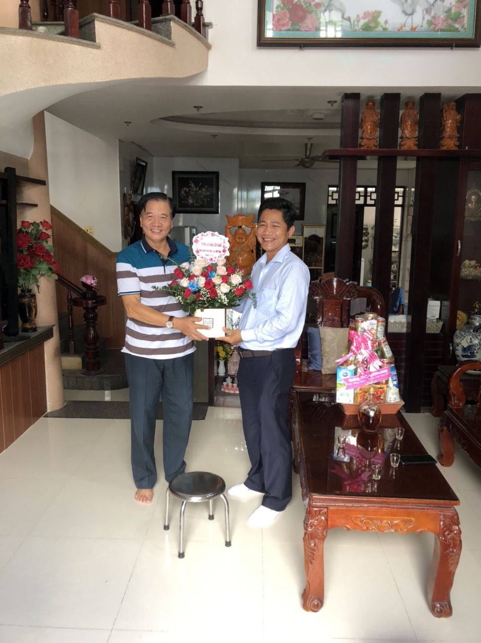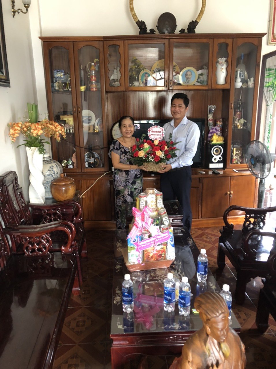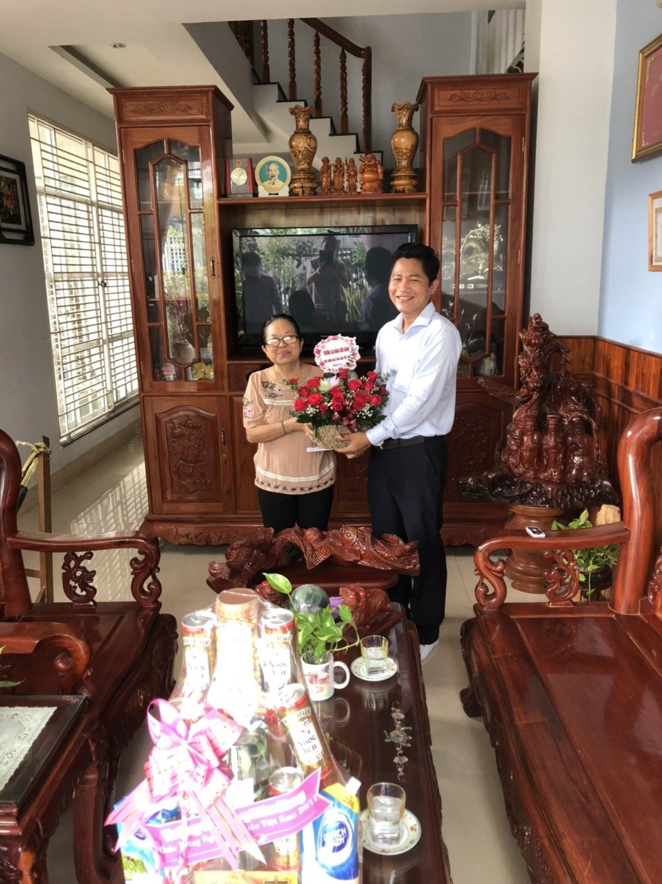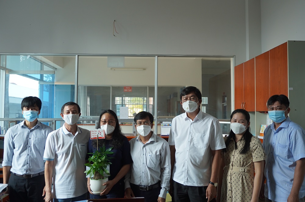 Thầy Lê Trung Kiên - Phó Hiệu trưởng, đại diện Ban Giám hiệu nhà trường gửi hoa và Thư chúc mừng của Hiệu trưởng nhân ngày 20-11 đến cô Võ Thị Xinh – nguyên Hiệu trưởng trường Cao đẳng Cộng đồng Kiên Giang