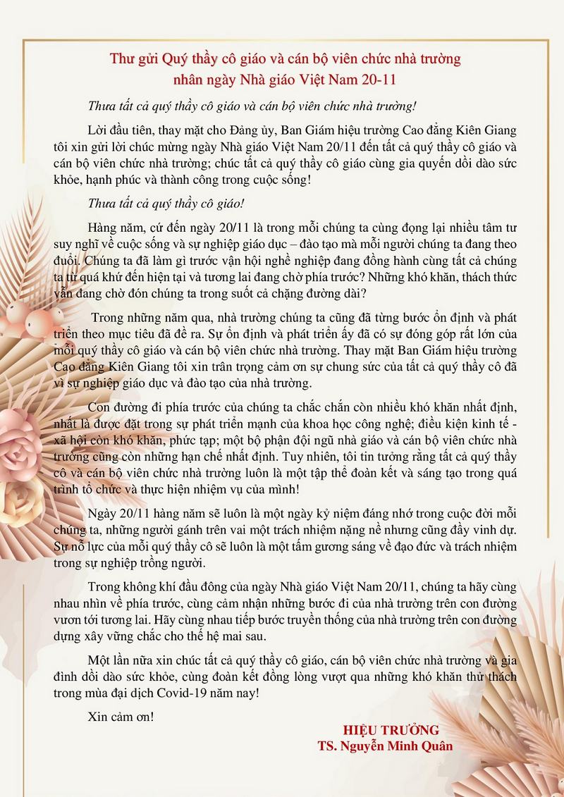 Mặc dù năm nay không được tổ chức Lễ Kỷ niệm, nhưng Ban Giám hiệu và Công đoàn cơ sở trường Cao đẳng Kiên Giang vẫn tổ chức đoàn đến trực tiếp các đơn vị để gửi Thư chúc mừng của Hiệu trưởng và quà kỷ niệm tới toàn thể cán bộ, giáo viên nhà trường nhân ngày 20-11. Đồng thời, đại diện Ban Giám hiệu và Công đoàn cơ sở trường cũng đã đến thăm hỏi, gửi hoa và Thư chúc mừng của Hiệu trưởng tới từng cựu cán bộ, giáo viên đã nghỉ hưu của trường. Ngoài ra, Đoàn thanh niên và Hội sinh viên trường đã tổ chức các hoạt động thiết thực cho học sinh, sinh viên như: Viết báo tường online, thiết kế thiệp điện tử, cuộc thi tìm hiểu pháp luật, các hoạt động văn hóa và các hoạt động ý nghĩa khác để chào mừng ngày Nhà giáo Việt Nam.