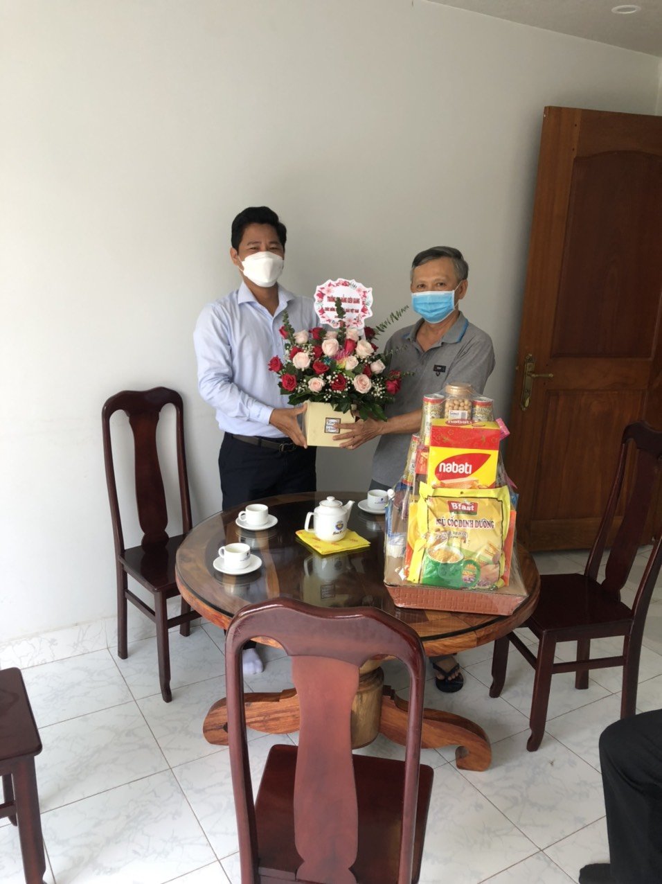 Thầy Lê Trung Kiên - Phó Hiệu trưởng, đại diện Ban Giám hiệu nhà trường gửi hoa và Thư chúc mừng của Hiệu trưởng nhân ngày 20-11 đến thầy Hồ Minh Triết – nguyên Hiệu trưởng trường Cao đẳng Kinh tế - Kỹ thuật Kiên Giang