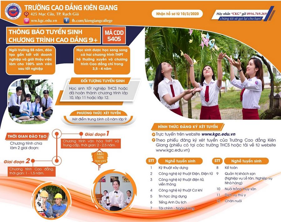 Trường Cao đẳng Kiên Giang hiện đang thực hiện đào tạo chương trình 9+ với nhiều ngành nghề đa dạng đáp ứng nhu cầu người học và có nhiều ưu điểm như:
