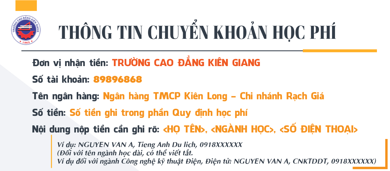 Nhằm thực hiện tốt quy định về phòng, chống dịch bệnh Covid-19, đảm bảo an toàn cho các thí sinh, trường Cao đẳng Kiên Giang mời các thí sinh trúng tuyển thực hiện thủ tục nhập học trực tuyến. (Danh sách thí sinh trúng tuyển mời các bạn xem tại đây: ).