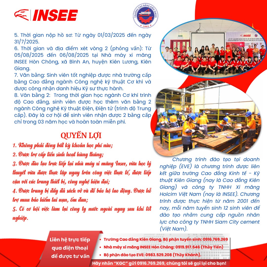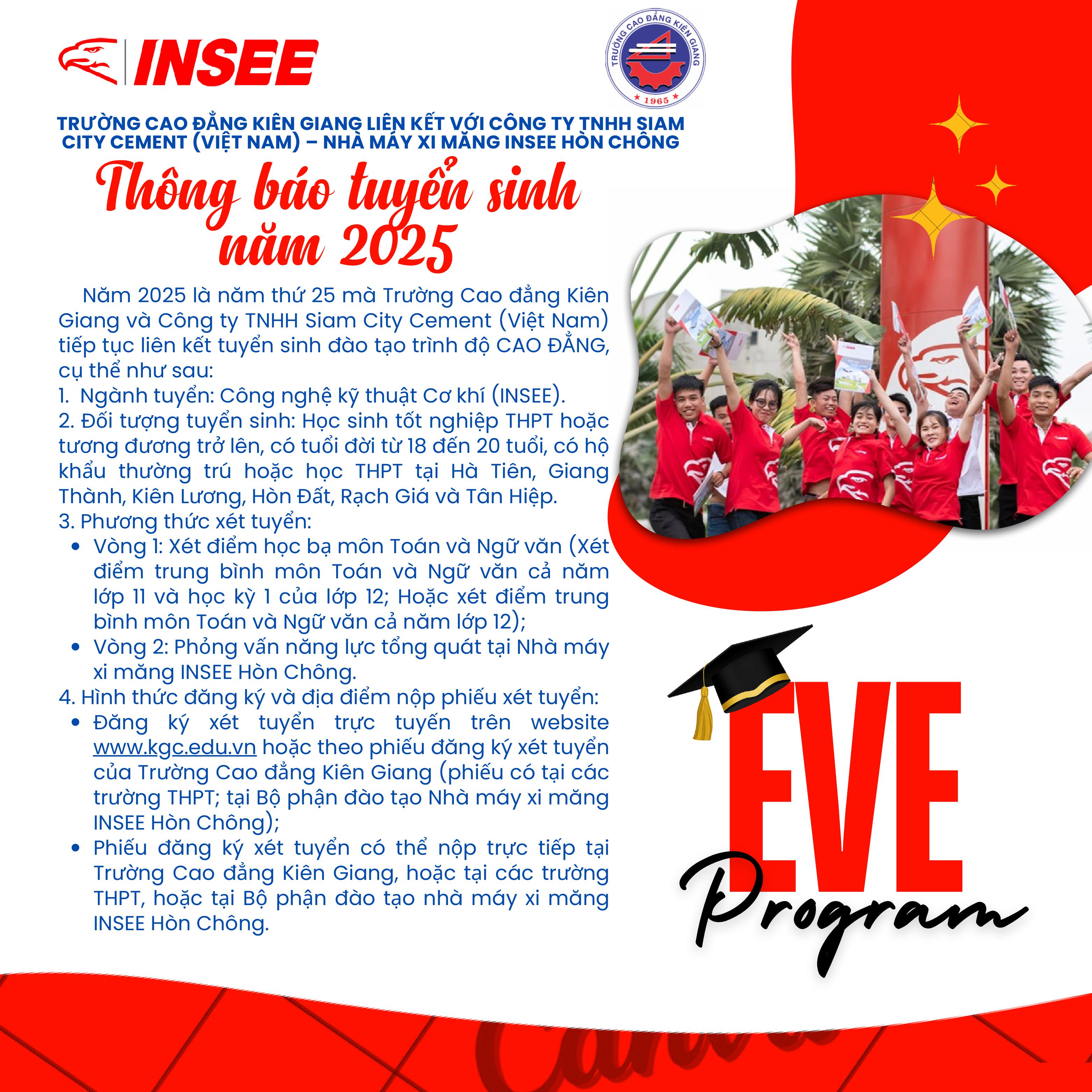Đây là chương trình hợp tác giữa Trường Cao đẳng Kiên Giangvà Công ty TNHH Siam City Cement (Việt Nam), được triển khai từ năm 2001 kéo dài cho đến nay với rất nhiều lợi ích vượt trội. Từ chương trình này, hàng trăm kỹ sư lành nghề đã được đào tạo và trực tiếp làm việc tại nhà máy INSEE cùng nhiều doanh nghiệp cơ khí lớn khác trong khu vực đồng bằng Sông Cửu Long.