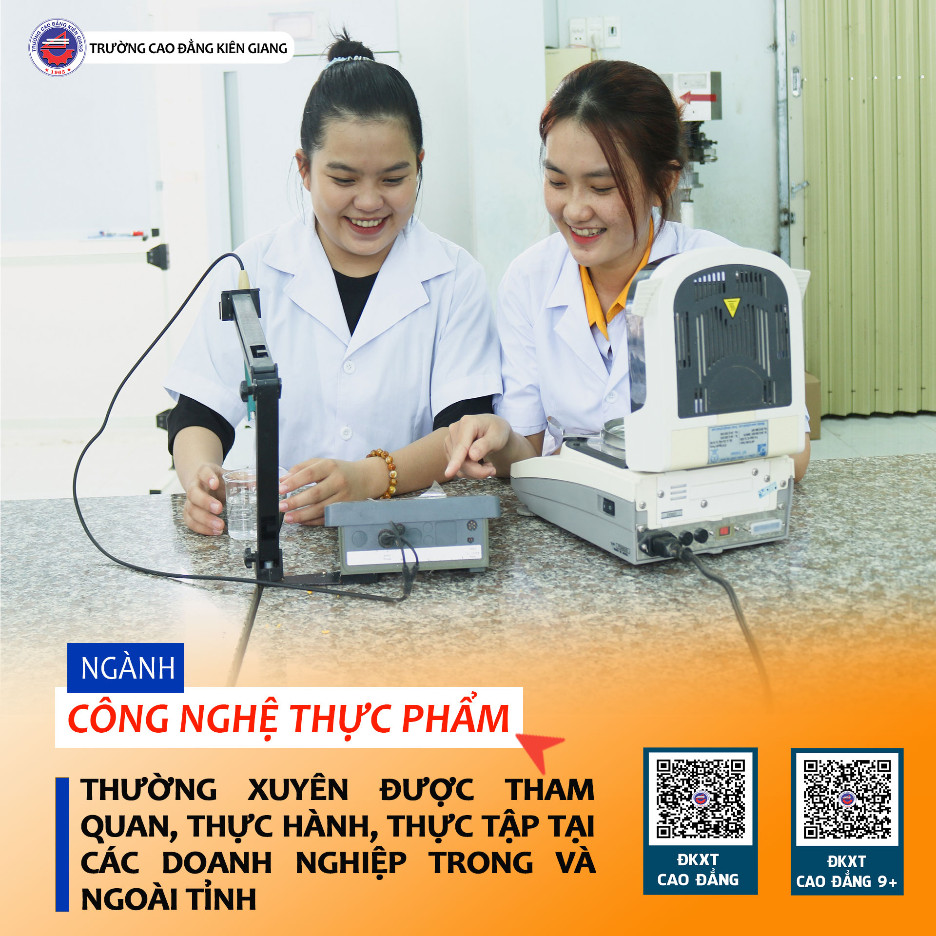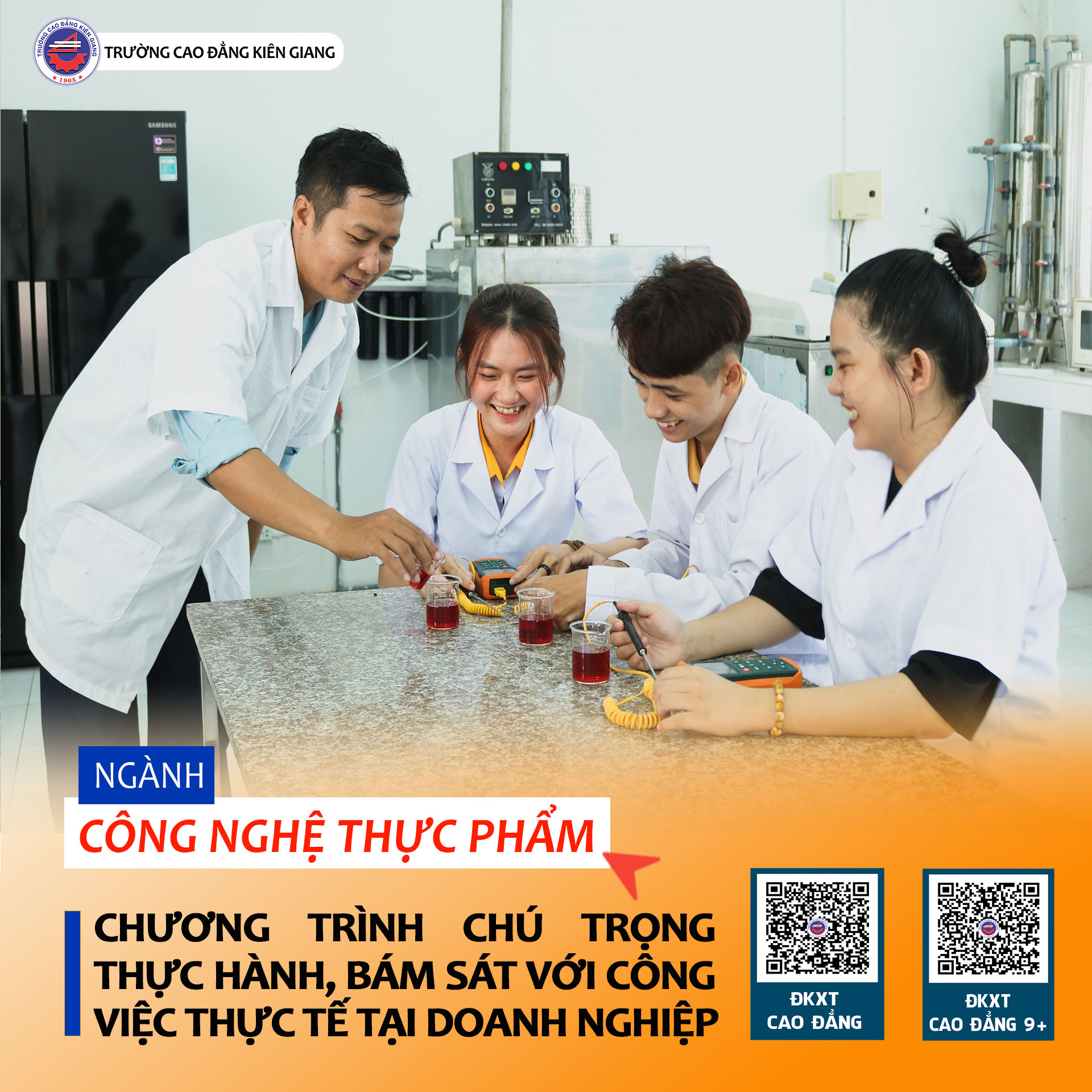 Trong bối cảnh xã hội ngày càng chú trọng đến an toàn thực phẩm và dinh dưỡng, ngành Công nghệ thực phẩm trở thành “ngành học vàng”, mở ra vô số cơ hội nghề nghiệp cho các bạn trẻ. Đây là lĩnh vực luôn có nhu cầu nhân lực cao và mang lại nguồn thu nhập đáng kể, bên cạnh đó môi trường làm việc cũng rất chuyên nghiệp, thường xuyên được tiếp cận với các công nghệ cao. Tại Trường Cao đẳng Kiên Giang, sinh viên ngành này được đào tạo theo hướng thực hành, ứng dụng, giúp các bạn sẵn sàng bắt tay vào công việc thực tế ngay sau khi tốt nghiệp. Tuy nhiên, hạn cuối nộp hồ sơ đã cận kề, các bạn thí sinh đừng nên bỏ lỡ cơ hội gia nhập một ngành học đầy triển vọng, mang lại cả tri thức lẫn sự nghiệp vững chắc trong tương lai nhé!