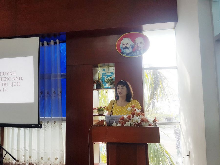 Cô Lê Thị Hồng - Trưởng khoa Ngoại ngữ phát biểu trong cuộc họp