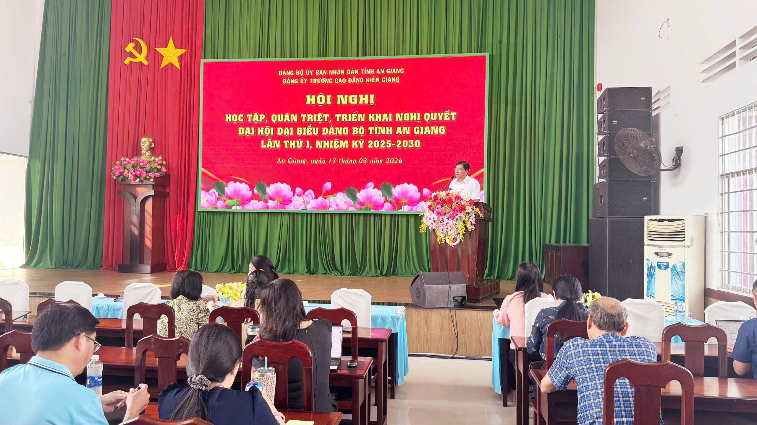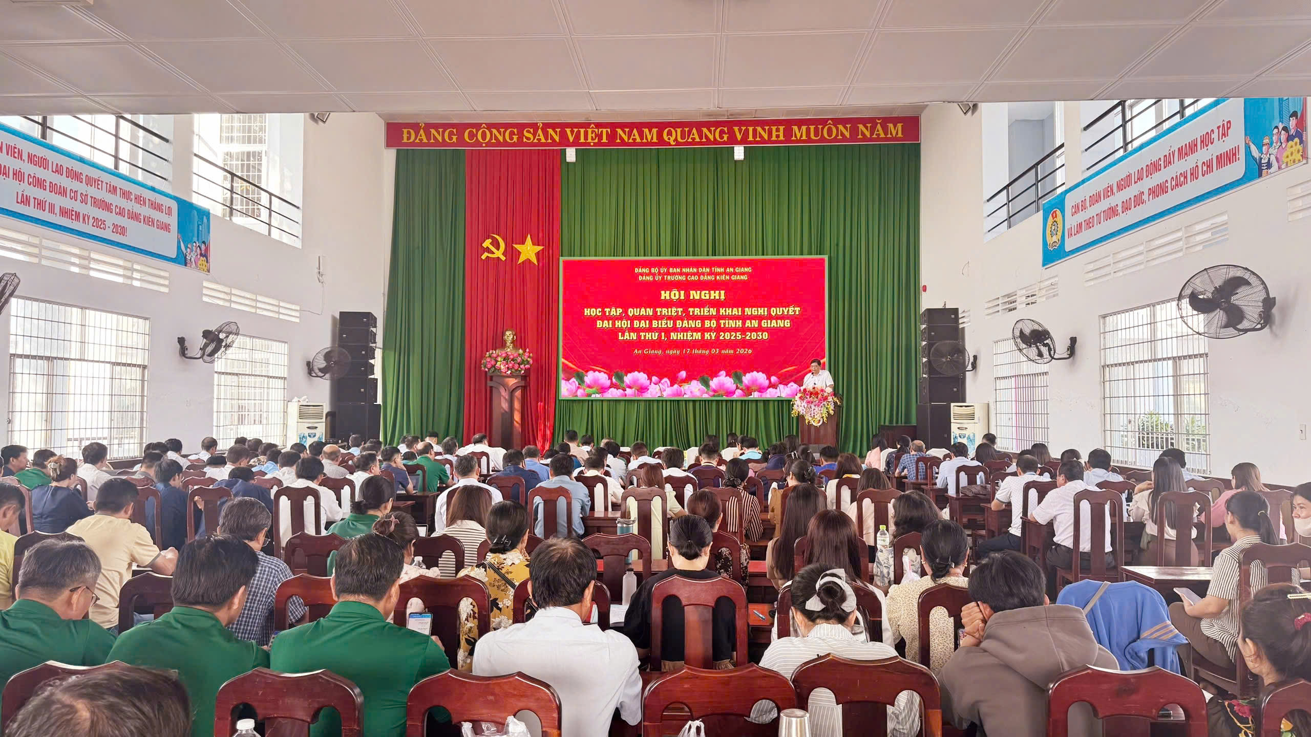 Sáng ngày 17/3/2026, tại Hội trường 425 Mạc Cửu, Đảng ủy Trường Cao đẳng Kiên Giang đã tổ chức Hội nghị học tập, quán triệt, tuyên truyền và triển khai thực hiện Nghị quyết Đại hội đại biểu Đảng bộ tỉnh An Giang lần thứ I, nhiệm kỳ 2025 – 2030. Tham dự sự kiện có toàn thể đảng viên, viên chức và người lao động thuộc Đảng bộ nhà trường. Hội nghị do đồng chí Nguyễn Minh Quân – Bí thư Đảng ủy, Hiệu trưởng nhà trường cùng đồng chí Lê Trung Kiên – Phó Bí thư Đảng ủy, Phó Hiệu trưởng nhà trường trực tiếp báo cáo và thông qua các nội dung trọng tâm của Nghị quyết.
